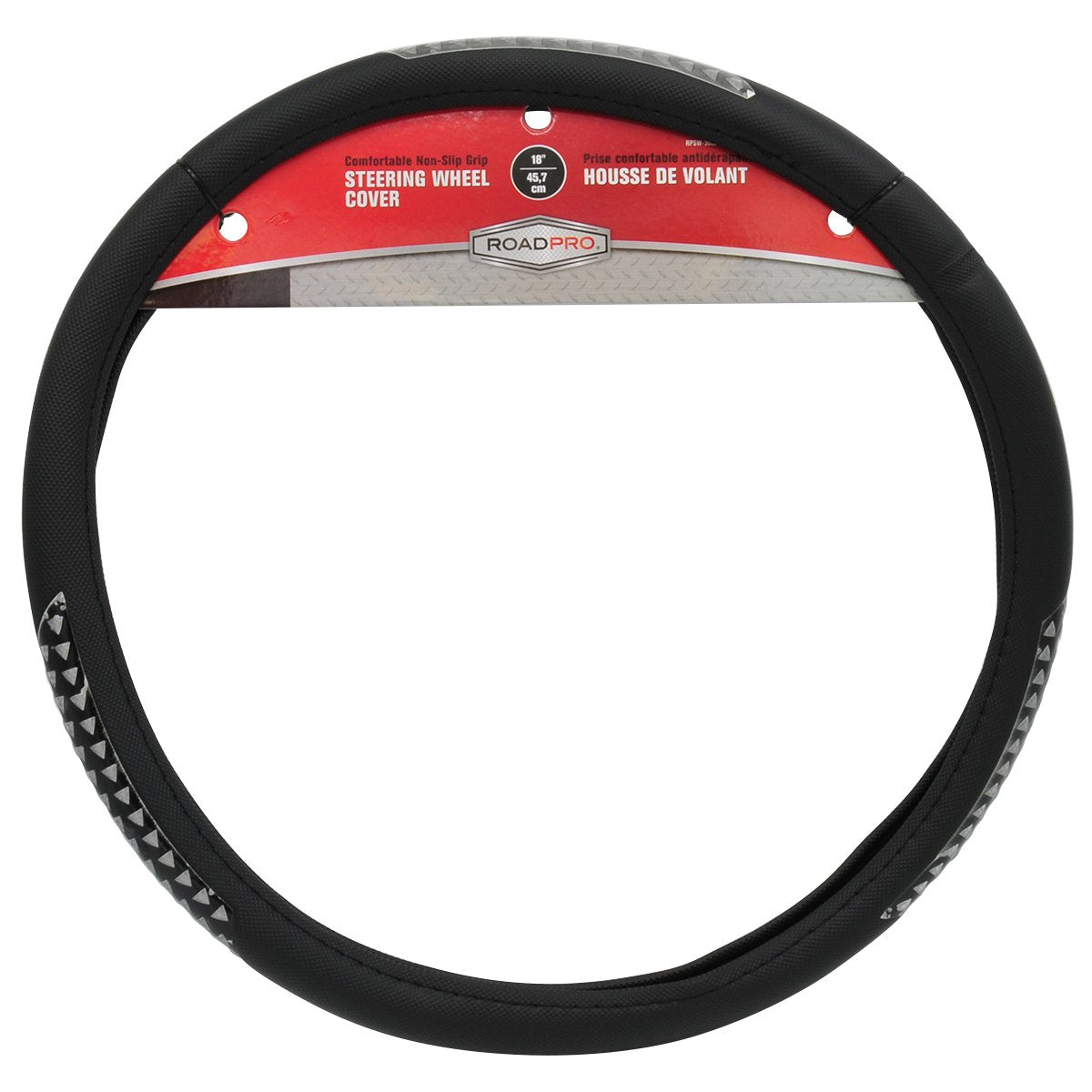 Q: What materials is the steering wheel cover made from?A: The RoadPro steering wheel cover is made from high-quality faux black leather, providing a comfortable and durable grip while enhancing the aesthetic of your vehicle's interior.