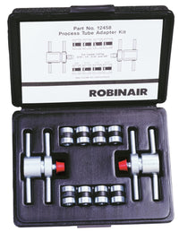 Q: What is included in the Robinair 12458 Process Tube Adapter Kit?A: The kit comes with multiple adapters suitable for different sizes of copper tubing and is packaged in a blow molded storage case to keep all components organized and contained.