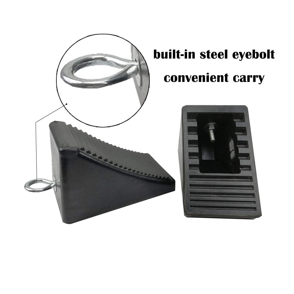 Roblock - Committed To Creating Premium Quality And High-Performance Rubber Wheel Chocks The Roblock Rubber Wheel Chocks (Set Of 2) With Eyebolt Do You Want A Wheel Chock That Stops, Grips, And Holds A Wheel Without Causing Damage? Our Rubber Wheel Chocks 2-Pack Is Meant To Stop Any Wheel And Is Composed Of Non-Slip Rubber That Stands Up To Heavy Loads And Harsh Climates. The Rubber Wheel Chock Features A Triangular Design To Be Placed Snugly Against Wheels, Raised Rib Pattern That Stops Your Equipment In Its Tracks As Well As Provides An Extra Grip On Asphalt As Well As Uneven Surfaces Where Slipping Is Most Likely To Occur. Wheel Chocks Include An Eyebolt For Attaching A Chain Or Rope For Easy Positioning And Removal Of Wheel Chocks For Travel Trailers. Eyehook Is Large And Comfortable To Grab So You Can Take With You On The Go; Place At Wheels To Keep Your Camper From Rolling Forward Or Backward When Unhooking Your Vehicle From It During Initial Set Up. Easily Hold Your Truck In Place When Launching Your Boat At A Boat Ramp. The Roblock Heavy-Duty Wheel Chocks Are Perfect For Trucks, Rvs, Trailers, Boats, And Other Heavy Equipment. Tips: As With Any Rubber Product, We Recommend Putting It In A Ventilated Environment To Dissipate The Odor. We Strive To Provide You With The Best Customer Service, And We Have A No-Risk Return Policy For Seven Days. If You Have Any Questions, Please Feel Free To Contact Us.