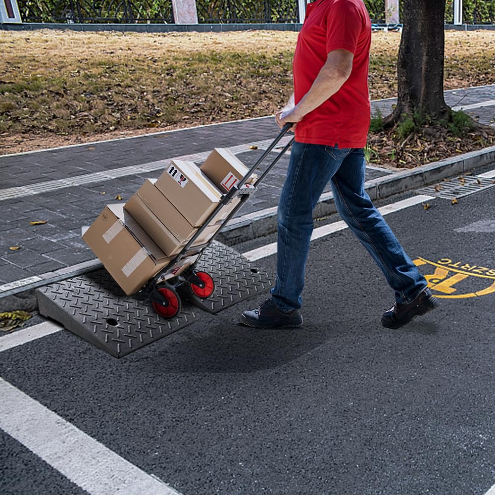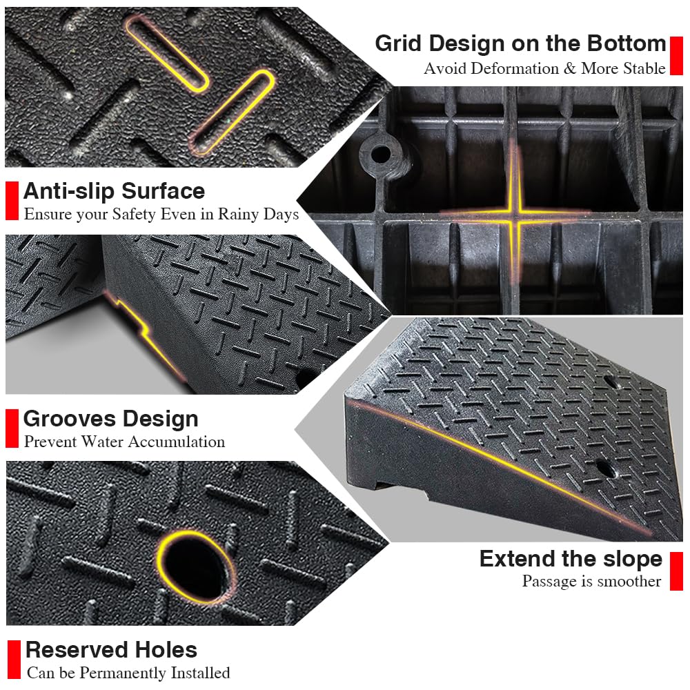 Upgraded In Size - 19.7” L X 19.7” W. 6' Height Driveway Curb Along Ramp Level With Most Lanes And Sidewalks. The Extended Length Smooths The Slope To A Gradient Of 17 Degrees. Anti-Slip And Reserved Hole Design - The Textured Surface Increases Friction And Prevents Skidding, Ensuring Safety. The Bottom Grid Lines Make It Easy To Carry And Provide Stability. Each Piece Has Reserved Holes On Both Sides And Contains 4 Bolts And Nuts For Easy Assembly. Heavy Duty - Our 6 'Curb Ramps Are Made Of Durable And High Quality Rubber Material.It Has Wear-Resistant And Weather-Resistant Materials For Long-Term Use, And A Large Load Capacity: 6800 Pounds /3 Tons, Which Will Better Help Your Vehicle Pass The Roadside. Multi-Purpose - These Shed Ramps Provide Great Convenience For Cars, Wheelchairs, Bikes, Trolleys, Lawn Mower And Pet Mobility. They Are Ideal For Garages, Warehouses, Barns, Stores. Please Check The Size Before Ordering. It'S Normal For The Ramp To Have A Slight Rubber Scent, Which Will Reduce After Being Aired Out. Contact Us If The Ramp Has Any Defects Or Quality Problems, And We'Ll Do Our Best To Solve Your Problem.