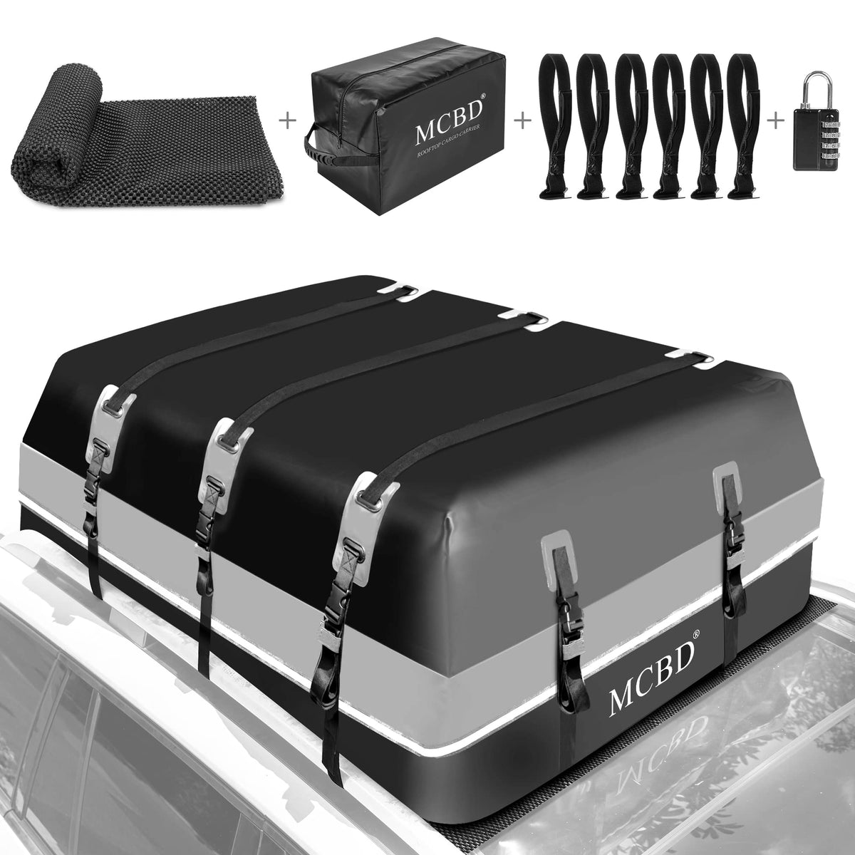 Q: How do I secure the cargo carrier to my vehicle?A: The carrier includes three reinforced adjustable straps that firmly secure it to your vehicle. Additionally, a bonus luggage lock is provided to prevent zippers from slipping and enhance the security of your belongings.