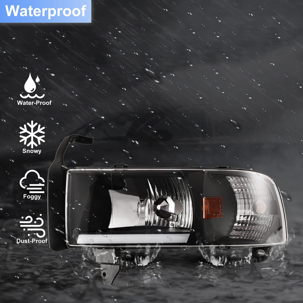 Q: How durable is the ROXX DRL Headlight Assembly in various weather conditions?A: The headlight assembly is designed to be waterproof, featuring solid silicon seals and one-way vents to prevent moisture buildup. Its polycarbonate lens and tough housing provide high resistance to shock and vibration, ensuring durability in tough road conditions.