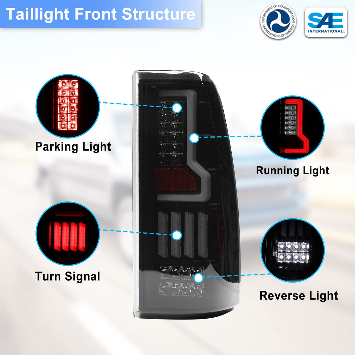 Q: Do these tail lights meet safety standards?A: Yes, the ROXX Full LED Tail Lights are DOT (Department of Transportation) and SAE (Society of Automotive Engineers) approved, ensuring they meet or exceed all regulations for safety and performance in both the U.S. and Canada.