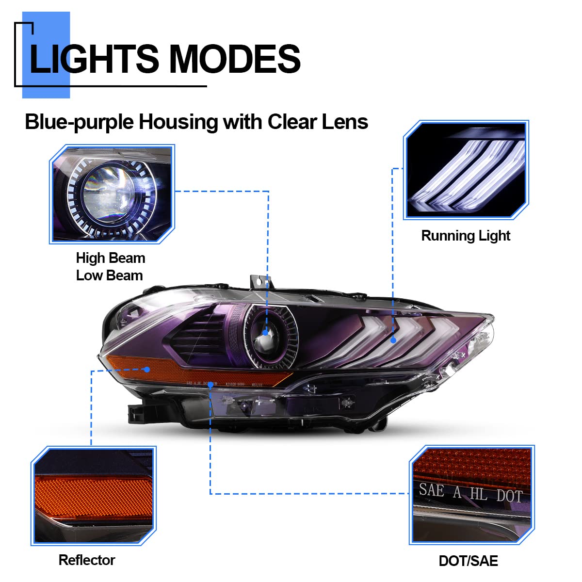 Roxx Headlights Compatible With 2018 2019 2020 2021 2022 2023 Ford Mustang, Projector Front Lamp Assembly W/Drl High Low Beam Reflector Passenger Driver Pair