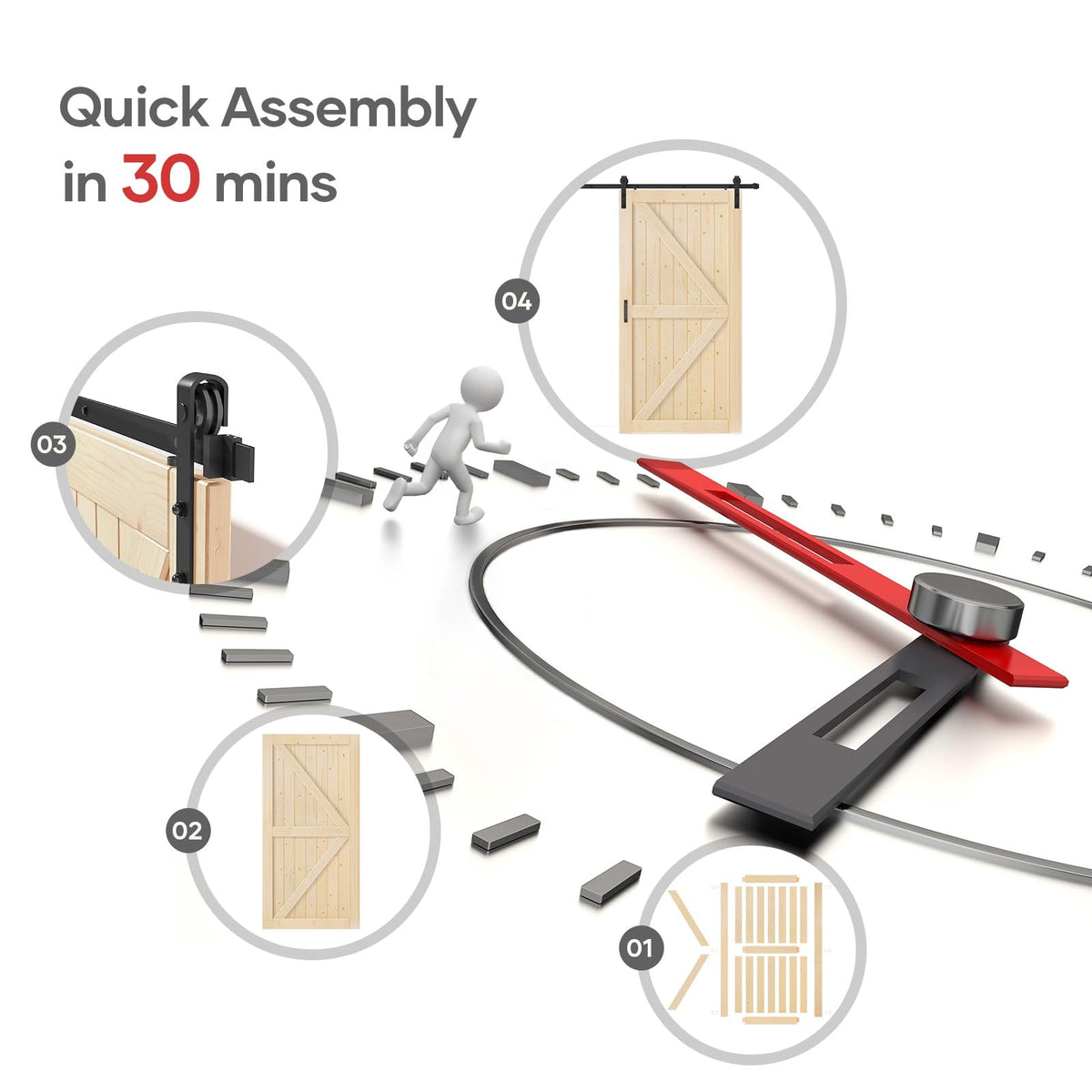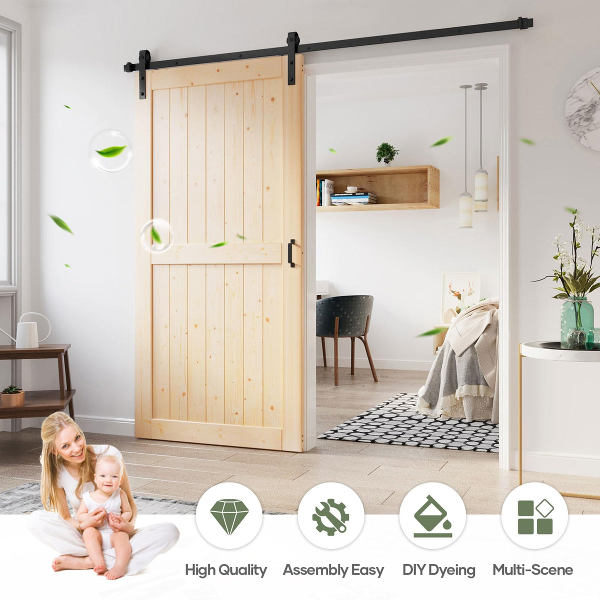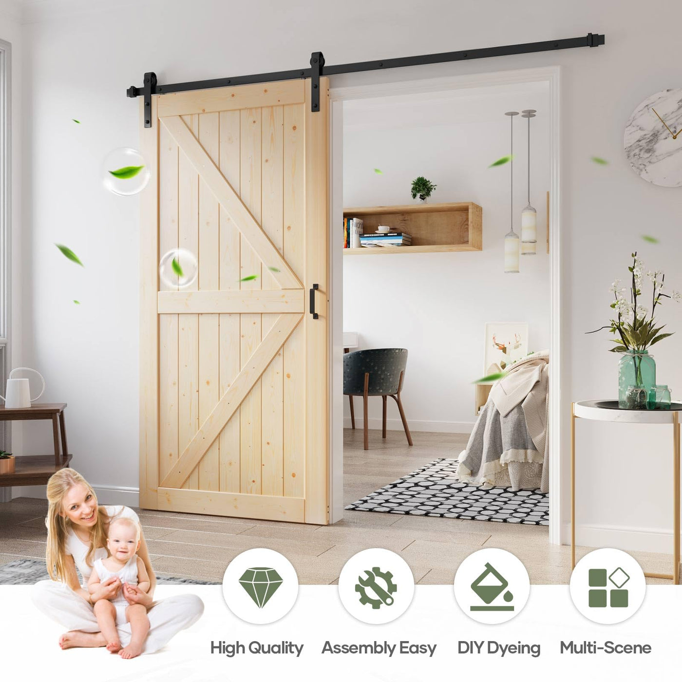 Q: Is the installation of the barn door easy for DIY enthusiasts?A: Yes, the installation is designed for DIY enthusiasts. The package includes separated wood boards and a complete barn door hardware kit with necessary screws and detailed instructions. All wood boards are pre-cut and pre-drilled, making assembly straightforward and similar to building blocks.