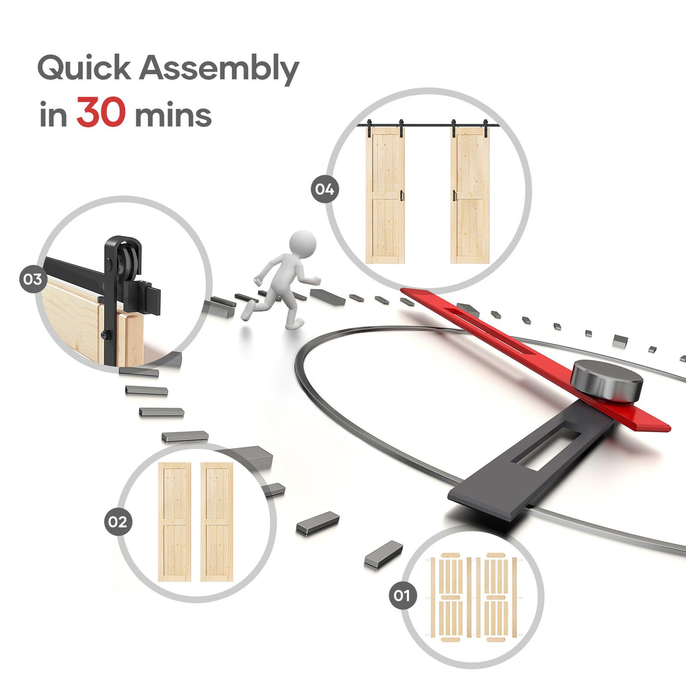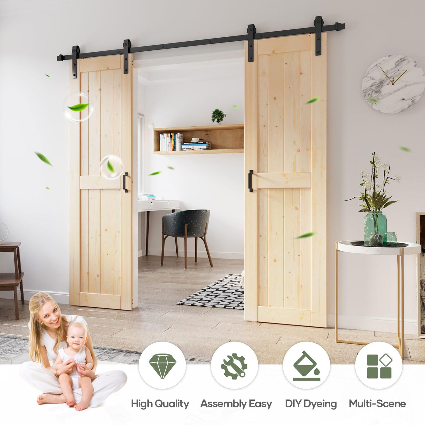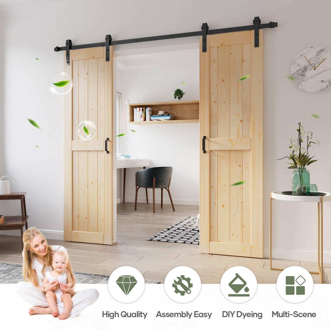 Q: Is the barn door suitable for DIY assembly?A: Yes, the barn door comes with all necessary hardware, pre-cut and pre-drilled wood boards, and detailed instructions, making it easy for anyone to assemble as a DIY project, similar to building with blocks.