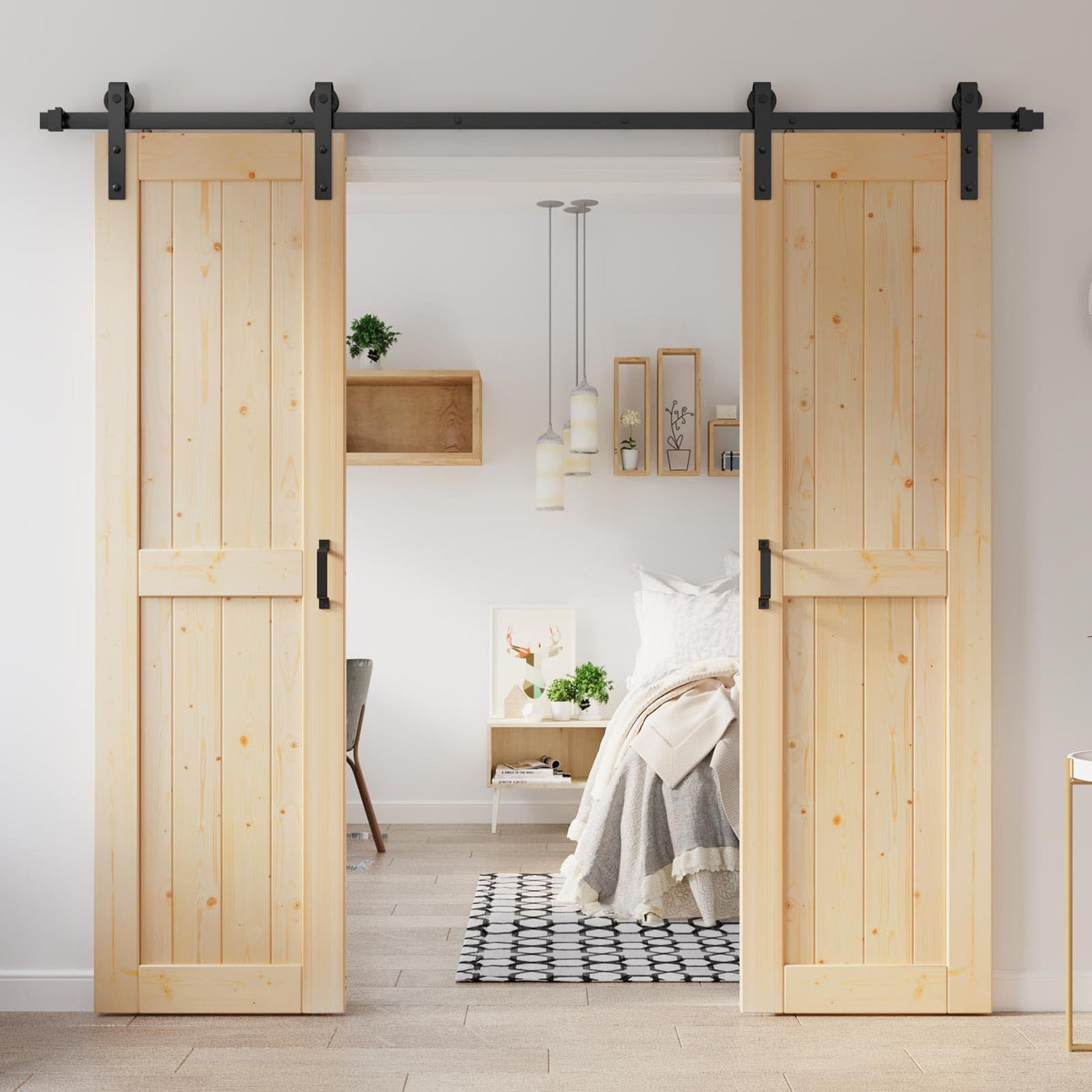 Q: What areas of my home can I use the sliding barn door?A: The barn door is versatile and can be used in various settings, including closets, bathrooms, kitchens, bedrooms, and living rooms, enhancing both functionality and aesthetics.