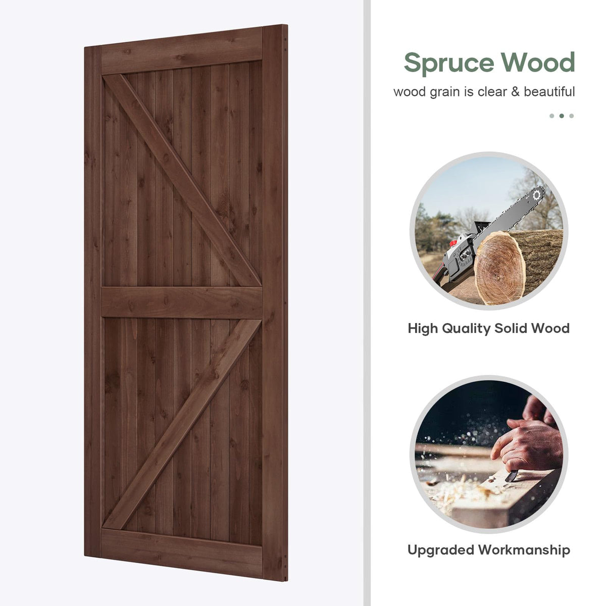 Q: What materials are used in the ROYMELO Sliding Barn Door?A: The ROYMELO Sliding Barn Door is made from high-quality spruce wood, known for its strength and durability. The clear wood grain provides a beautiful finish, and the fresh smell enhances the overall aesthetic of your living space.