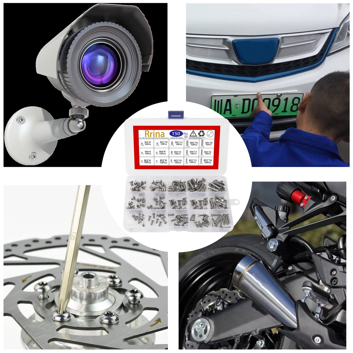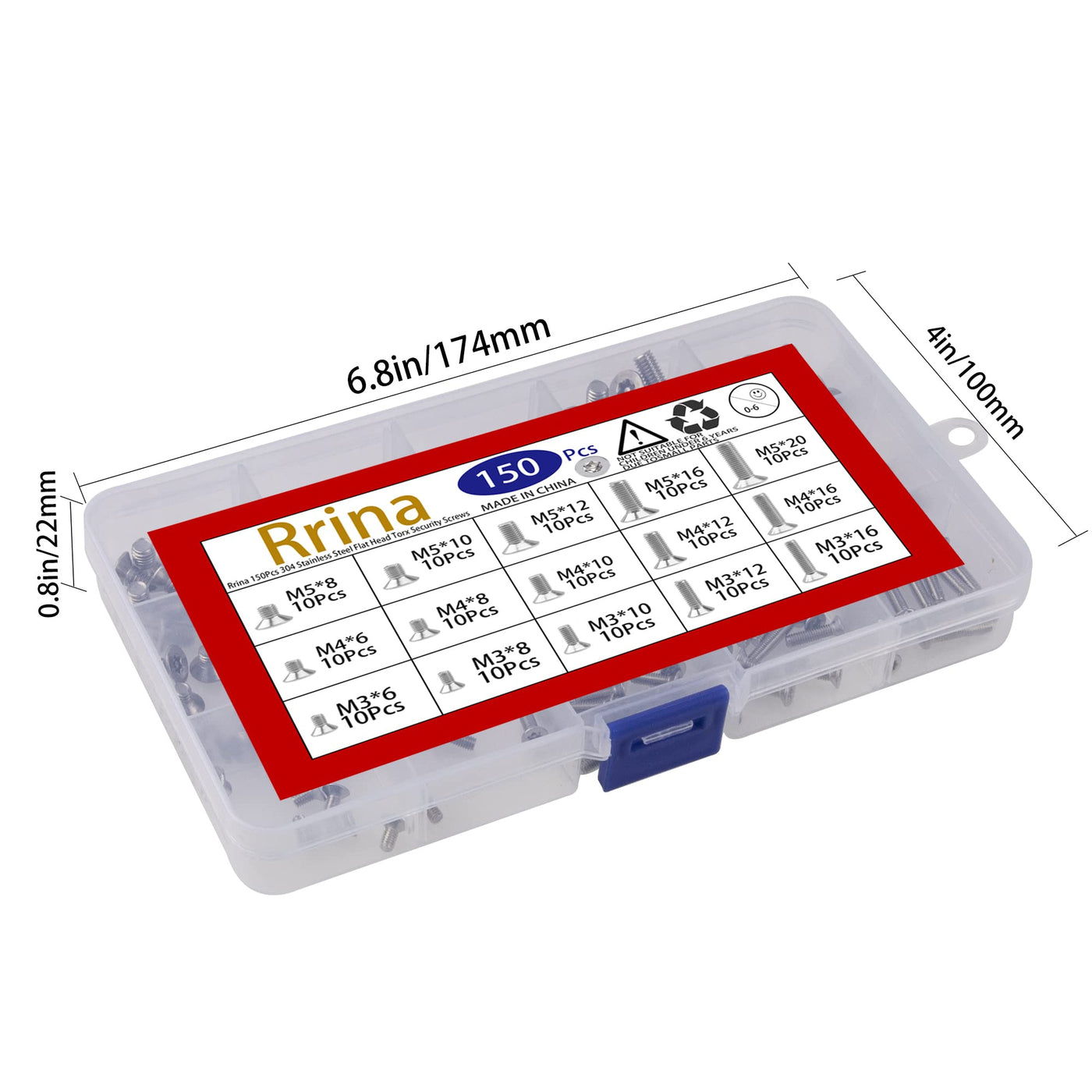 Q: How many pieces and sizes are included in the Rrina screw assortment set?A: The Rrina screw assortment set includes 150 pieces of Torx security screws in 15 different sizes: M3 (6/8/10/12/16mm), M4 (6/8/10/12/16mm), and M5 (8/10/12/16/20mm). Additionally, the set comes with 3 wrenches for convenience.