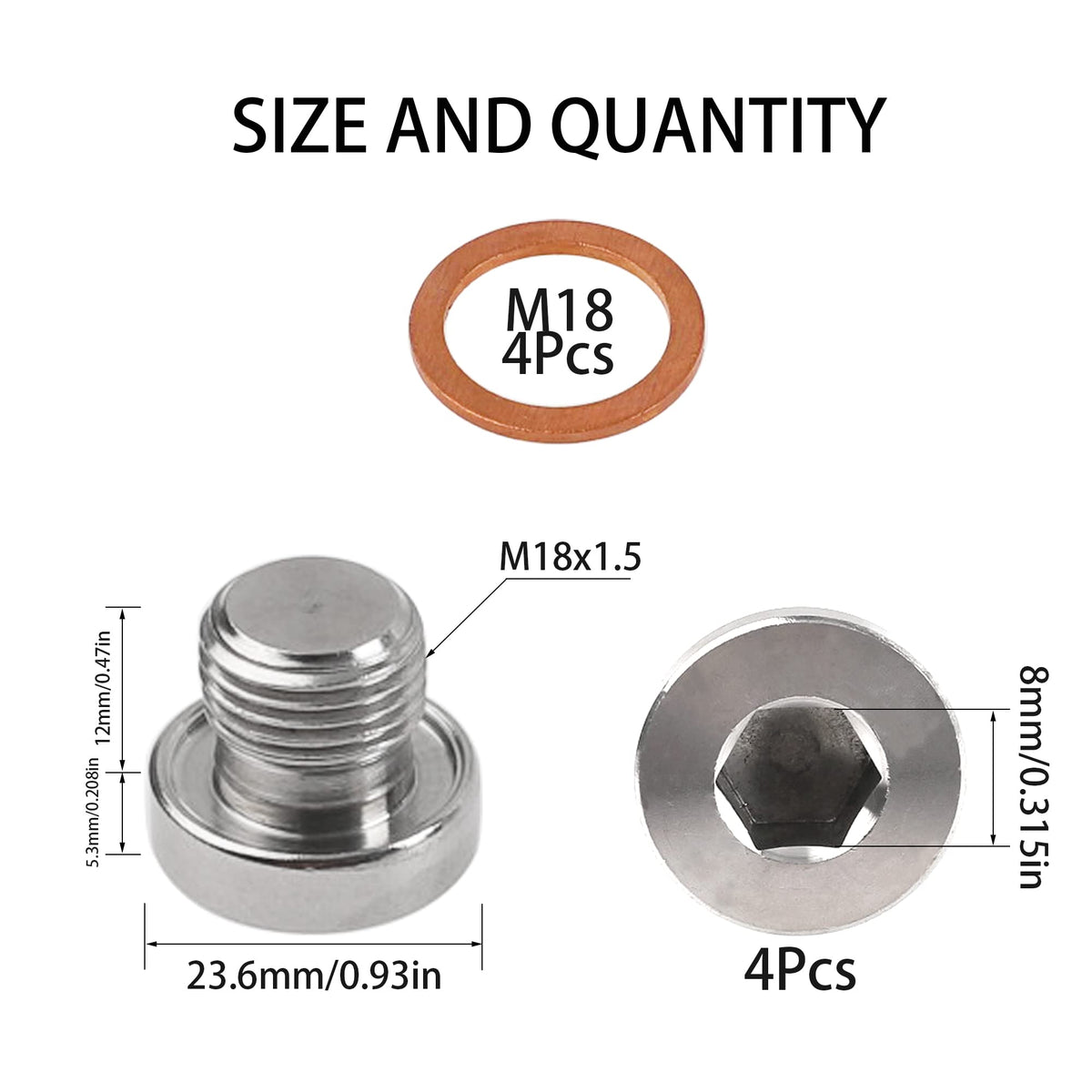 Material: Made Of Thick 304 Stainless Steel, Strong And Durable, High Strength, Not Easy To Rust, Anti-Moisture, Anti-Oxiclation, Corrosion Resistant, Washers Are Red Copper. Size: Thread Size: M18, Length 12Mm/0.47In. Advantage - Comes With A Sealing Ring For Tight Sealing. Use For Replacement Of Sensors And Industrial Pipes, Garden, Swimming Pool Water Pipe Ends, Etc. In Automobiles, Motorcycles And Ships. Note: Before Placing An Order, Please Make Sure That The M18 Pitch 1.5 Is Suitable. Note: Due To The Difference Between Different Monitors, The Picture May Not Reflect The Actual Color Of The Item. Customers Service: We Will Support Lifetime Garrantee And 100% Money Back For Your Problem, In Addition, We Offer 24H Always Online Service, Welcome To Come To Us If You Need Help.