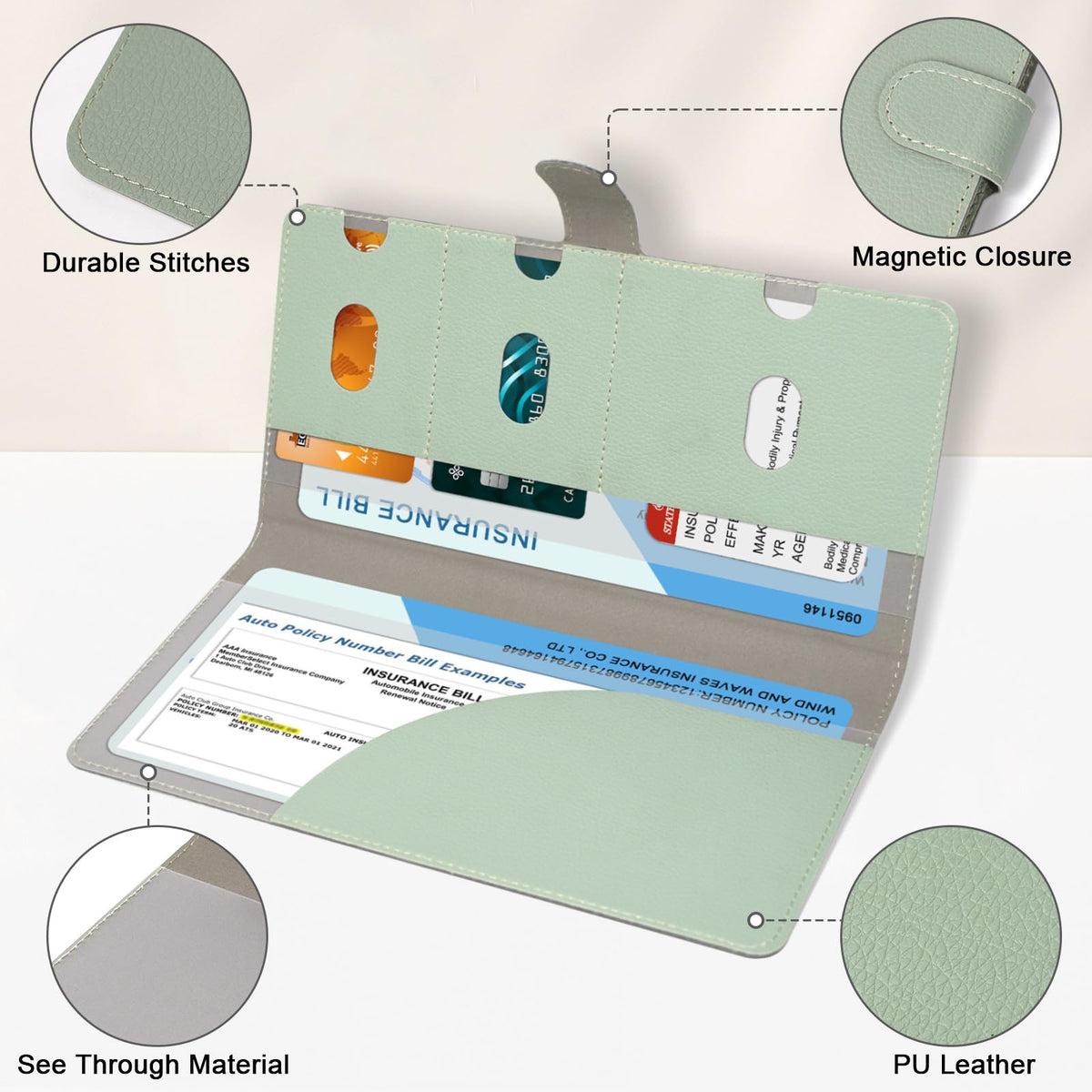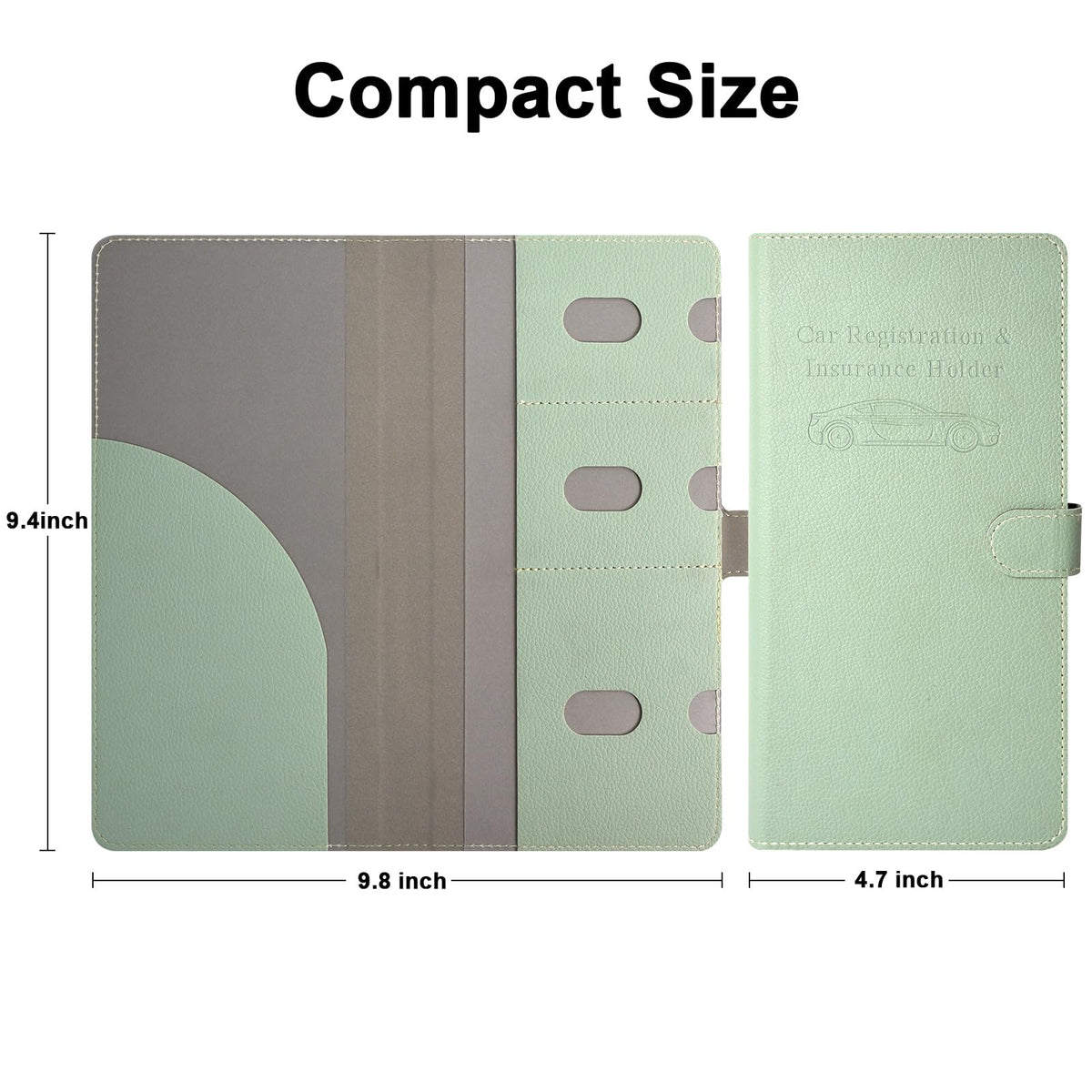 Q: How can I organize my documents using this car document holder?A: This car document holder features custom-made multi-function clear compartments, including a large pocket for insurance documents, two pockets for vehicle registration, and three small pockets for driver's licenses, ID cards, and business cards, ensuring your documents are well-organized.