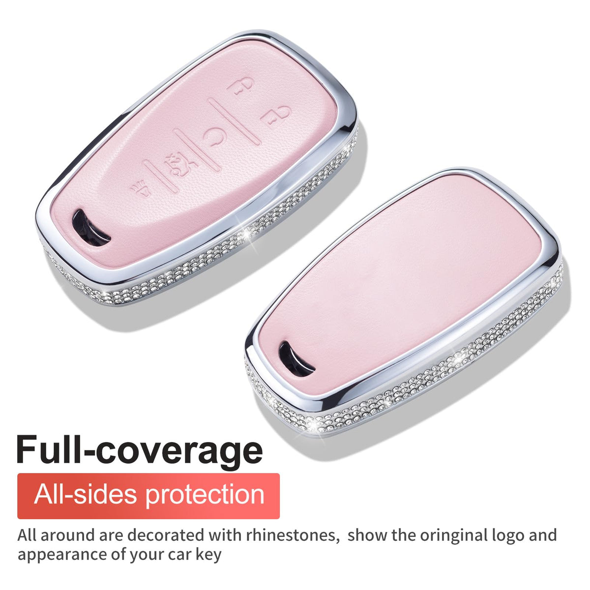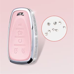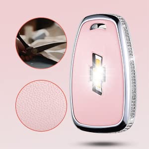 RUABIBAN for Chevy Key Fob Cover with Keychain, Pink Genuine Leather Crystal Key Case Protection Shell Compatible with Chevrolet Equinox Malibu Cruze Camaro Tahoe Silverado Traverse Blazer Sonic