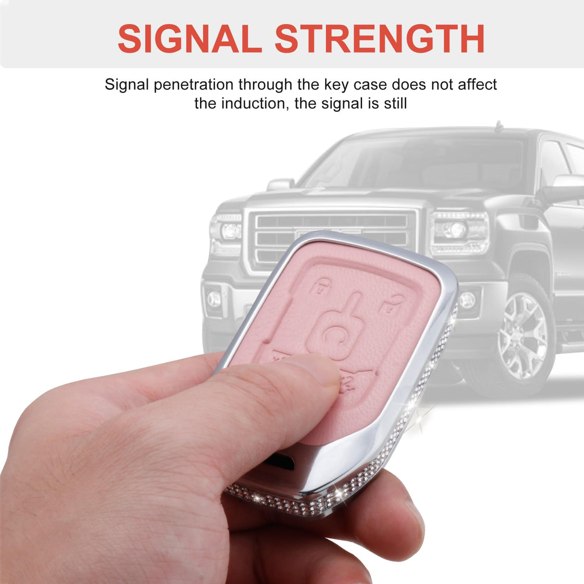 Ruabiban For Gmc Key Fob Cover With Keychain, Pink Leather Crystal Key Case Protection Shell Compatible With Chevy Chevrolet Gmc
