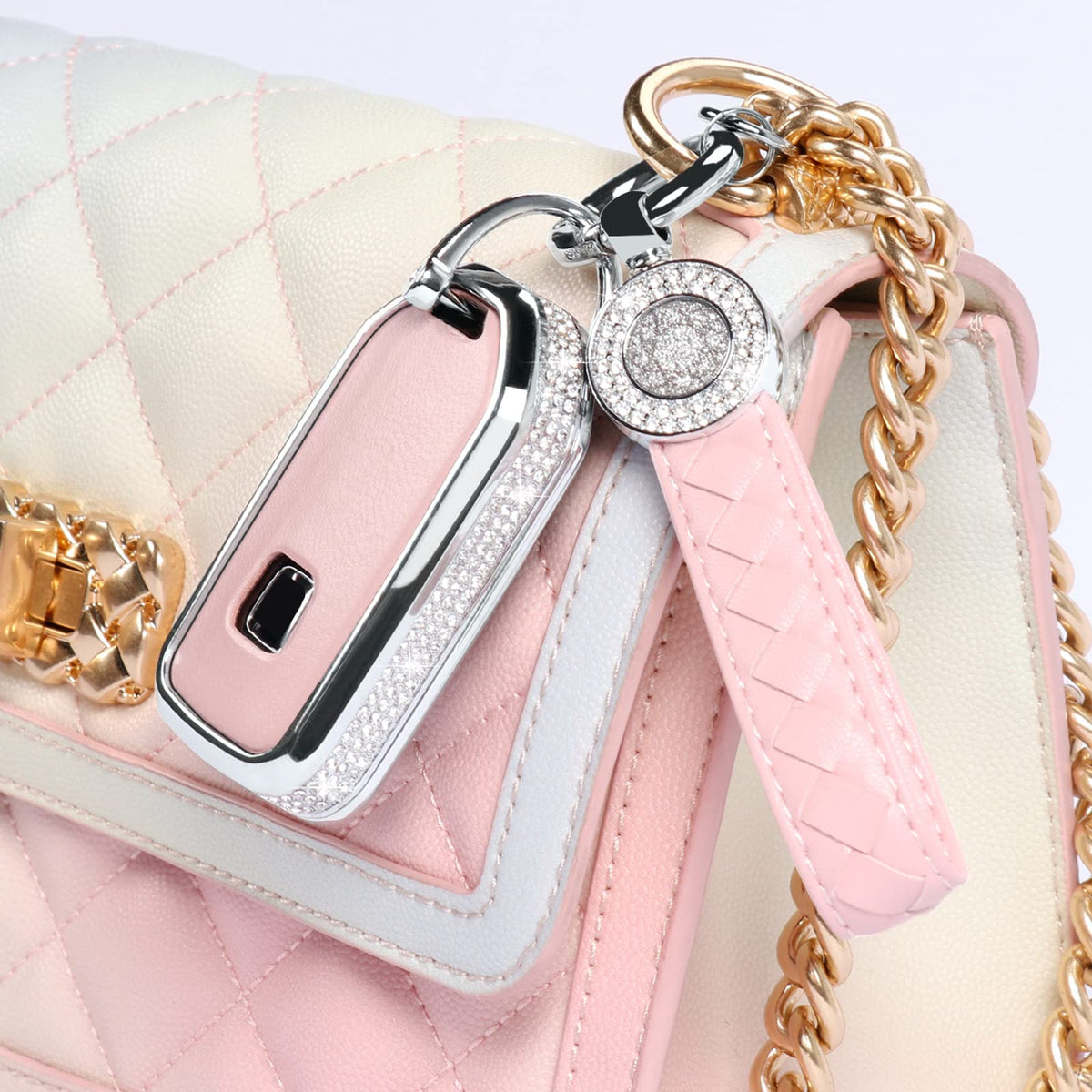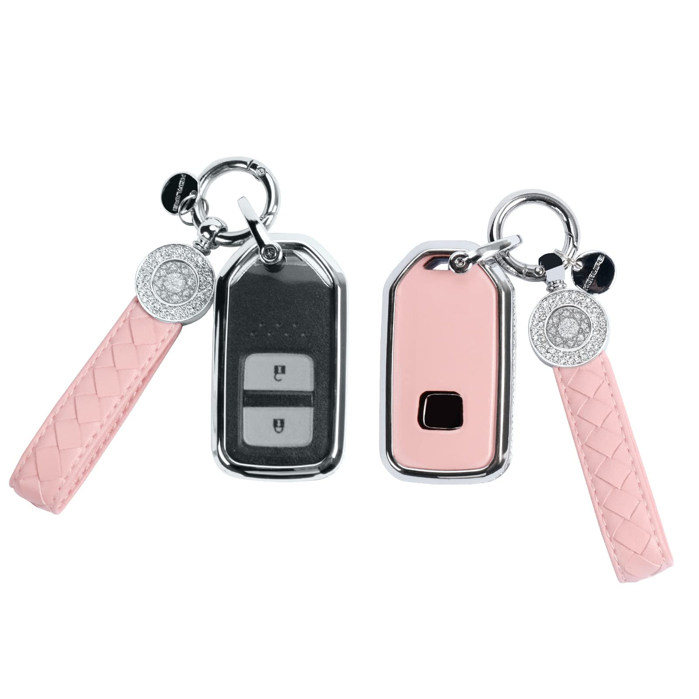 Ruabiban For Honda Key Fob Cover With Keychain, Pink Leather Crystal Key Case Protection Shell Compatible With Honda Accord Civi