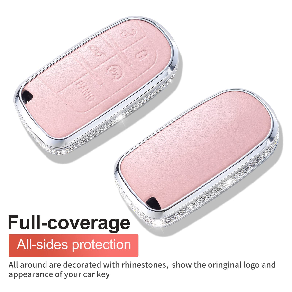 Ruabiban For Jeep Key Fob Cover With Keychain, Pink Genuine Leather Crystal Key Case Protection Shell Compatible With Jeep Smart
