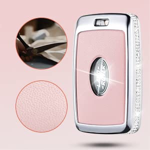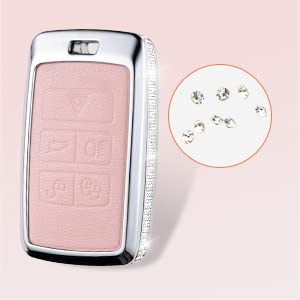 Ruabiban For Land Rover Key Fob Cover With Keychain, Pink Genuine Leather Crystal Key Case Protection Shell Compatible With Land