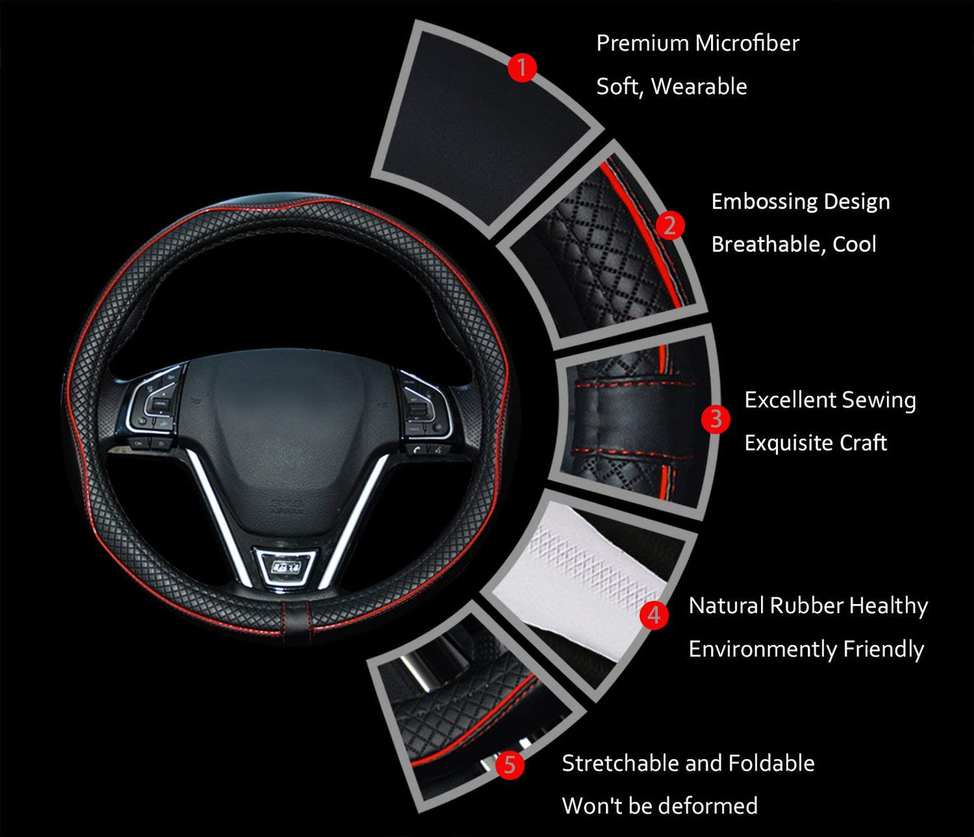 Rueesh Microfiber Leather Car Steering Wheel Cover, Soft Padding, Durable, No Smell, Universal 15 Inch Steering Cover, Anti-Slip