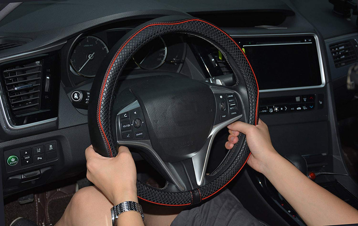 Rueesh 15 Inch Middle Size Steering Wheel Covers For Men ?Color: Black, Blue, Red, Brown. ?Diameter (steering wheels): 15 inch / 38 cm. ?100% Brand new and high quality. ?Universal Auto Car Steering Wheel Cover. ?Good quality and you can feel comfortable. ?Make your car personalized and Luxury. ?Good gift for yourself, your family or friend. HOW TO INSTALL ?If it is difficult to put it on at first time, because it has kind of hard rubber coating inside, you can heat it up a little under the sun to soften the rubber then put it while its warm. Its easier to stretch it a little. ?1.Turn off the engine, make sure the steering wheel keep fixed. ?2. Put the steering wheel cover on the top of steering wheel, pull tight the steering wheel cover from top to about half both side. ?3. Turn out the edge of the rest cover and keep it touching the steering wheel's edge, then keep pulling tight the steering wheel cover from side to bottom. ?4. Fix the bottom of steering wheel cover, then rotate and adjust the wheel cover to the best situation. PACKAGE INCLUDE: ?1* Car Steering Wheel Cover For Men