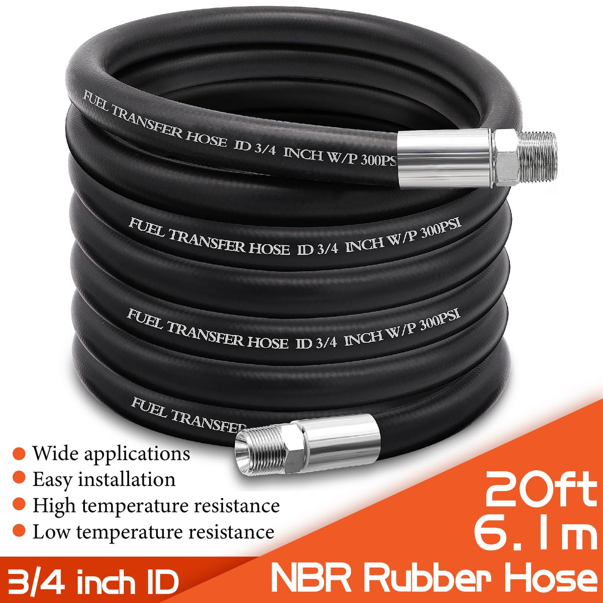 Designed For Use With Electric Pumps To Dispense Gasoline,Diesel,Kerosene And Oil.Widely Used As Farm Tank Hose, Fuel Pump Hose, Diesel Fuel Hose And Gas Tank Hose,Etc.This High Quality Hose Is Constructed With A Built-In Static Wire To Dissipate Static Electricity Associated With Electric Pumps.Coupled With 3/4 Male Fittings On Each End And Internal Spring Guards, Which Prevent Kinking At The Fittings And Extends The Life Of The Hose.The Material Nbr Makes It Flexible Oil Resistant And The Small Diameter Design For Close Quarters.Lightweight, Durable, And Dependable, This Short Fuel Transfer Hose Is Perfect For A Variety Of Uses. Product Parameter: Material:Pvc,Rubber,Stainless Steel Color: Black Hose Length: 20 Feet Male Npt Fittings: 3/4-Inch Inner Diameter: 3/4-Inch Weight:7 Pounds Working Pressure:300 Psi Bursting Pressure: 1160Psi Working Temperature Range: -40 F - 257F Min.Bending Radius: 1100Mm Product Characteristics: Not Easy To Age Long Service Life Oil Resistant Cold-Resistant High Negative Pressure Resistance Corrosion Resistance Non-Toxic Material Kink Resistant