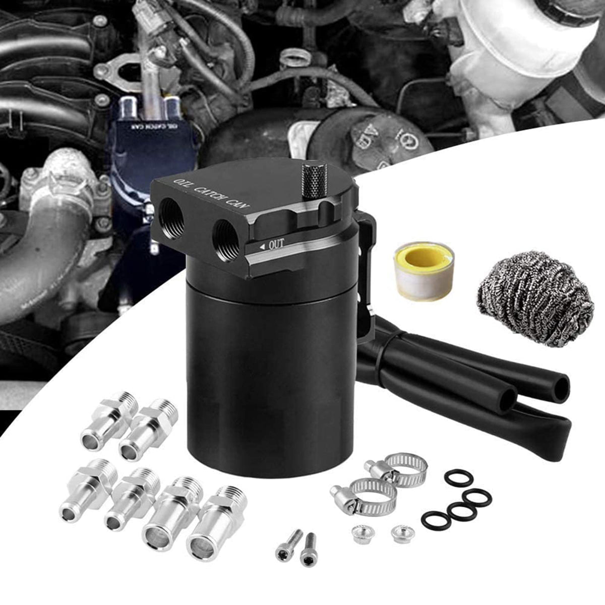[ Capture Oil & Keep Engine Clean ]-- The oil catch tank will catch the oil and moisture from PCV/CCV air, prevent carbon and sludge build-up in the intake system and the engine, keep engine clean and prolongs its life. | [ Good Sealing to Prevent Leakage ]-- Fully Tig Welded and comes with O-ring gasket in fittings to prevent oil leakage, works great as a sealed catch can.Made of high quality 0046 aluminum for added strength and durability, fully tig welded, lightweight and corrosion resistant | [ Come with Oil Dipstick ]-- It is convenient to check the fluid level in catch can by oil dipstick without opening it frequently | [ Duranble no Leakage ]--Introducing our upgraded oil canister with a durable braided hose! No more wasting money on replacing flimsy rubber tubes. Our new hose ensures longevity, reliability, and superior performance, providing you with peace of mind and saving you money. Upgrade today for a premium, built-to-last solution. | [ 350ML Capacity for Universal Car ]-- 350ml Capacity catch can comes with 3 types of adapters, Universal for most car .