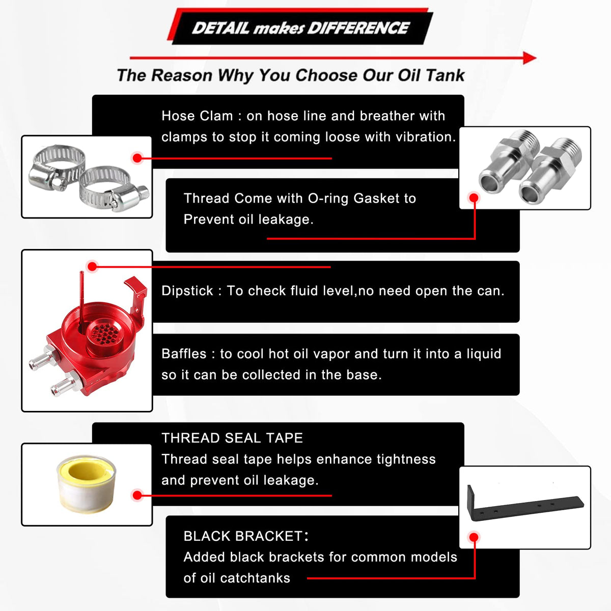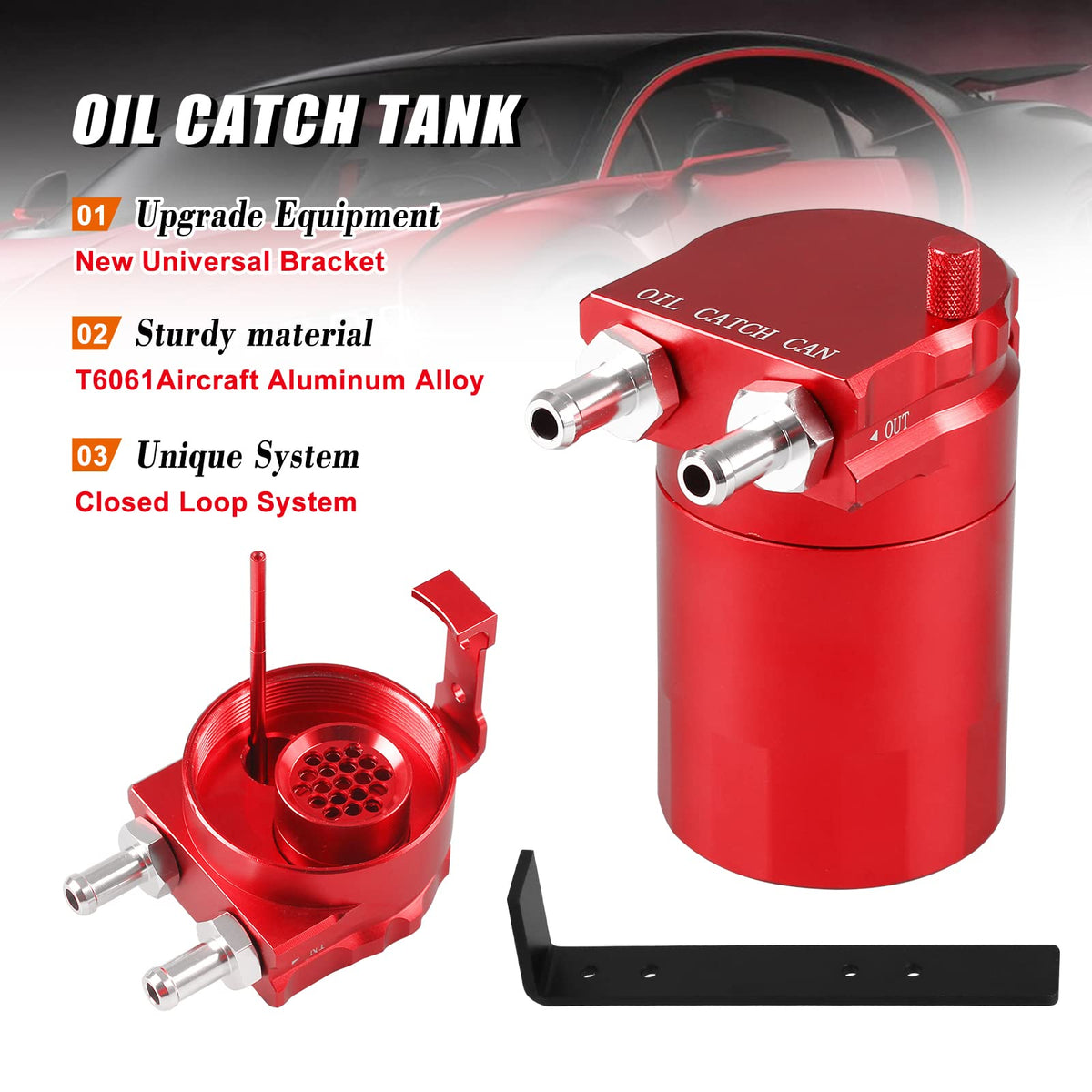 Description: Compatible With ]-- 350Ml Capacity Catch Can Comes With 3 Types Of Adapters, Universal For Most Car Such As Subaru Honda Toyota Ford Niissan Dodge Etc Capture Oil & Keep Engine Clean ]-- The Oil Catch Tank Will Catch The Oil And Moisture From Pcvccv Air, Prevent Carbon And Sludge Build-Up In The Intake System And The Engine, Keep Engine Clean And Prolongs Its Life Good Sealing To Prevent Leakage ]-- Fully Tig Welded And Comes With O-Ring Gasket In Fittings To Prevent Oil Leakage, Works Great As A Sealed Catch Can Made Of High Quality 0046 Aluminum For Added Strength And Durability, Fully Tig Welded, Lightweight And Corrosion Resistant Come With Oil Dipstick ]-- It Is Convenient To Check The Fluid Level In Catch Can By Oil Dipstick Without Opening It Frequently Material And Size]-- Its Made Of Aluminium Allow T-6061 350Ml Oil Catch Can Diameter: 269In 6825Mm Height: 428In 10866 Mm The Thread Of The Inlet And Outlet Is M16*15 Hose Length: 315In08M Fixed Steel Frame Length: 67In19Cm Material:Aluminum Color: Red Products Include: Oil Can *1 Leather Tube*1 Bracket*1 1 Set Of Clamp Nuts Note: Please Allow 1-3Cm Differs Due To Manual Measurement Due To The Different Display And Different Light, The Picture May Not Reflect The Actual Color Of The Item Thanks For Your Understanding Please Tell Us First When You Have Any Problem, We Will Give You The Best Service And Solve The Problem Asap Thank You So Much This Product Is Designed And Tested To Provide The Highest Degree Of Performance And Usability- Under Extreme Conditions- For Demanding Users Thank You For Supporting Our Small Business