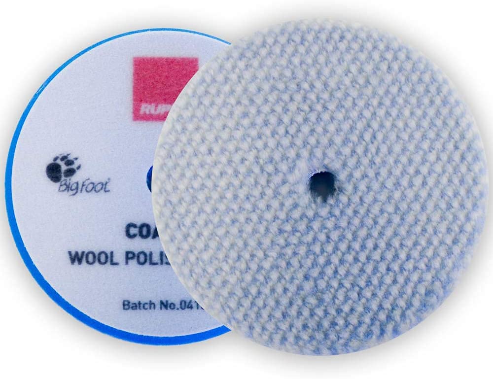 Q: What makes the RUPES BigFoot Blue Coarse Wool Pad different from other wool pads?A: The RUPES BigFoot Blue Coarse Wool Pad features a unique dual-density wool design that balances cutting power and finishing ability. Its rigid blue foam support enhances comfort and performance, allowing the pad to conform to the contours of body panels.