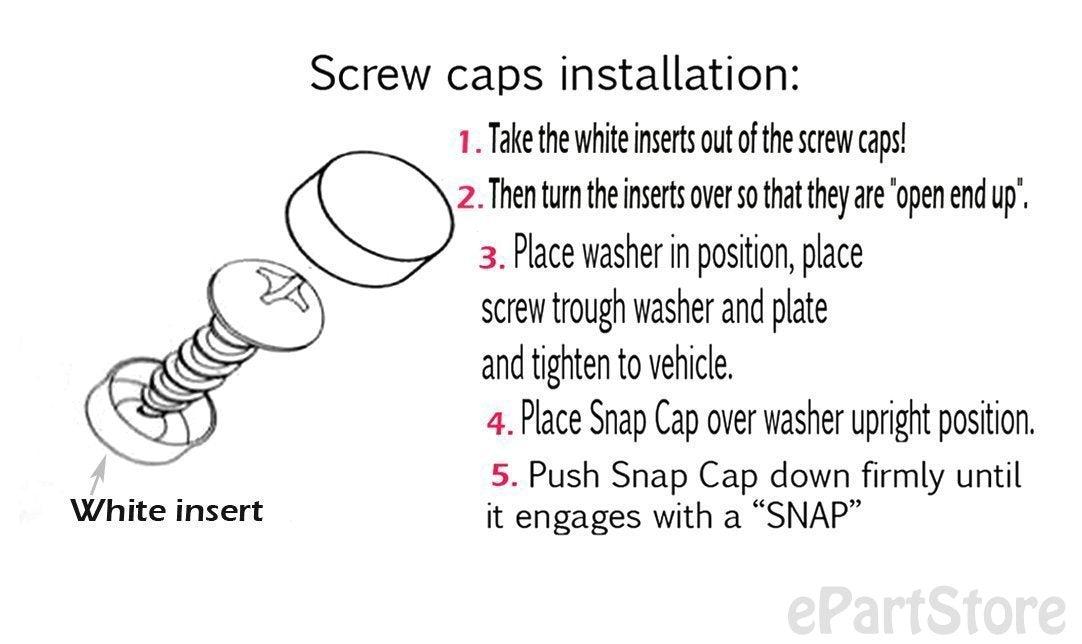 Stainless Steel License Plate Frame Screws Fasteners with Chrome Screw Caps and screwdriver. These screws are made of high quality Stainless Steel for license plates and frames. Rust Resistant, will never rust. (Sold by ePartStore). SATISFACTION GUARANTEE: You will receive, EXACTLY [ AS PICTURED ] / EXACTLY [ AS DESCRIBED ]. We take pride in delivering top quality products and are proud to offer our friendly 90 day money back guarantee in case you are not 100% satisfied and wish to return the product for ANY reason. (From ePartStore ONLY).