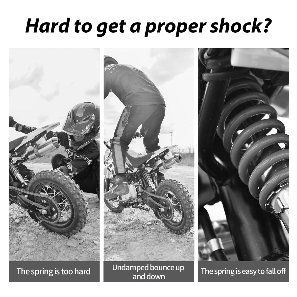 Q: What is the weight capacity of the RUTU Rear Shock?A: The RUTU Rear Shock has a shock rating of 400 lbs, making it suitable for light to moderate loads. This ensures that it can effectively handle the demands of various pit bikes and dirt bikes within the specified engine range.