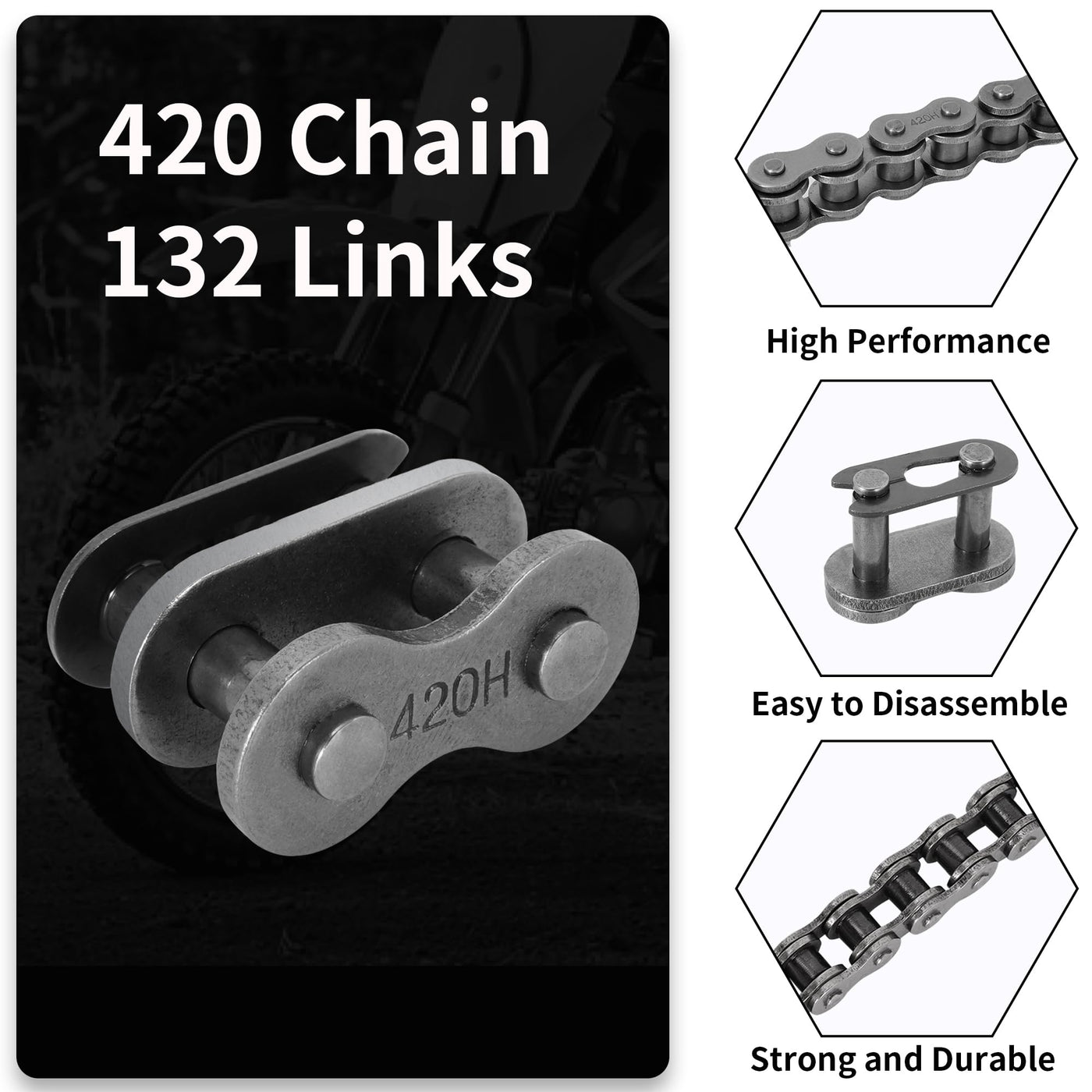 Heavy Duty: Constructed with upgraded materials, the 420H motorcycle chain features thicker links that provide high tensile strength, making it 36 times more durable than standard chains. The increased rigidity minimizes power loss, allowing for a more efficient ride.
