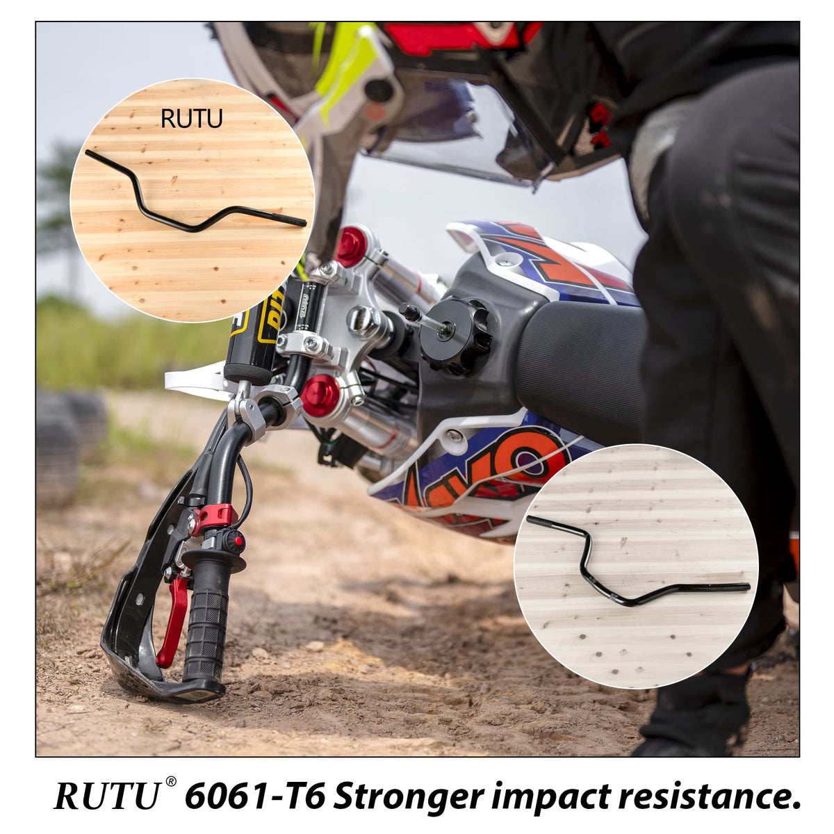 Q: How durable are the RUTU dirt bike handlebars?A: These handlebars are made from high-strength 6061-T6 aluminum, which has undergone HRC16 heat treatment. This makes them lightweight yet durable, capable of withstanding damage from falls and collisions.