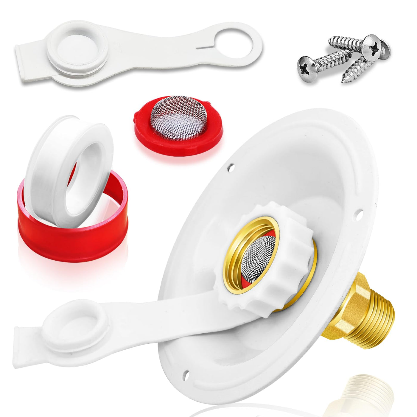 RV City Water Check Valve Water Fill Inlet Flange Lead-free Brass Flush Mount City Water Inlet 3/4NH Female to 1/2NPT Male Backflow Preventer with Dust Plug for RV Camper Motorhome Trailer Marine Features: City water check valve replaces a leaking or damaged valve on your RV Lead-free brass camper water inlet won't contaminate incoming water or rust over time Easy-grip knob of RV water flange lets you easily attach and detach your hose RV water inlet connection with surface-mount metal flange is durable and corrosion-proof Rubber cap protects connection point when not in use Package Included: 1 x RV city water inlet check valve 1 x Dust plug 1 x Sealing tape