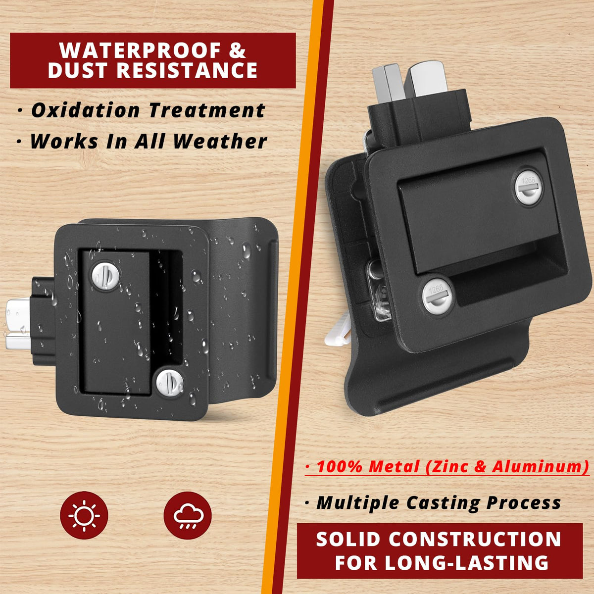 RAMKLE NEW UPGRADED RV DOOR LOCK - Making your RV safely lock counts! Features: - Zinc alloy all metal material - Easy to install - Keep you and your family safe - Different lock cylinders for each set of products - Dust & waterproof - Free installation tools - Corrosion-resisting, oxidation treatment, wear resistance - Replaces most popular locks with an opening of 3.6'' x 2.67'' x 1.5'' How to Replace: - Install the front part into the door - Mounting strike plate - Verify the deadbolt knob to match the front part - Assemble the back part, and mount pinch plate and tighten the screws Package Includes: - 1 x RV door lock - 4 x mechanical keys - 10 x screws of different lengths - 1 inside Latch - 1 outside Latch - 1 x installation manual