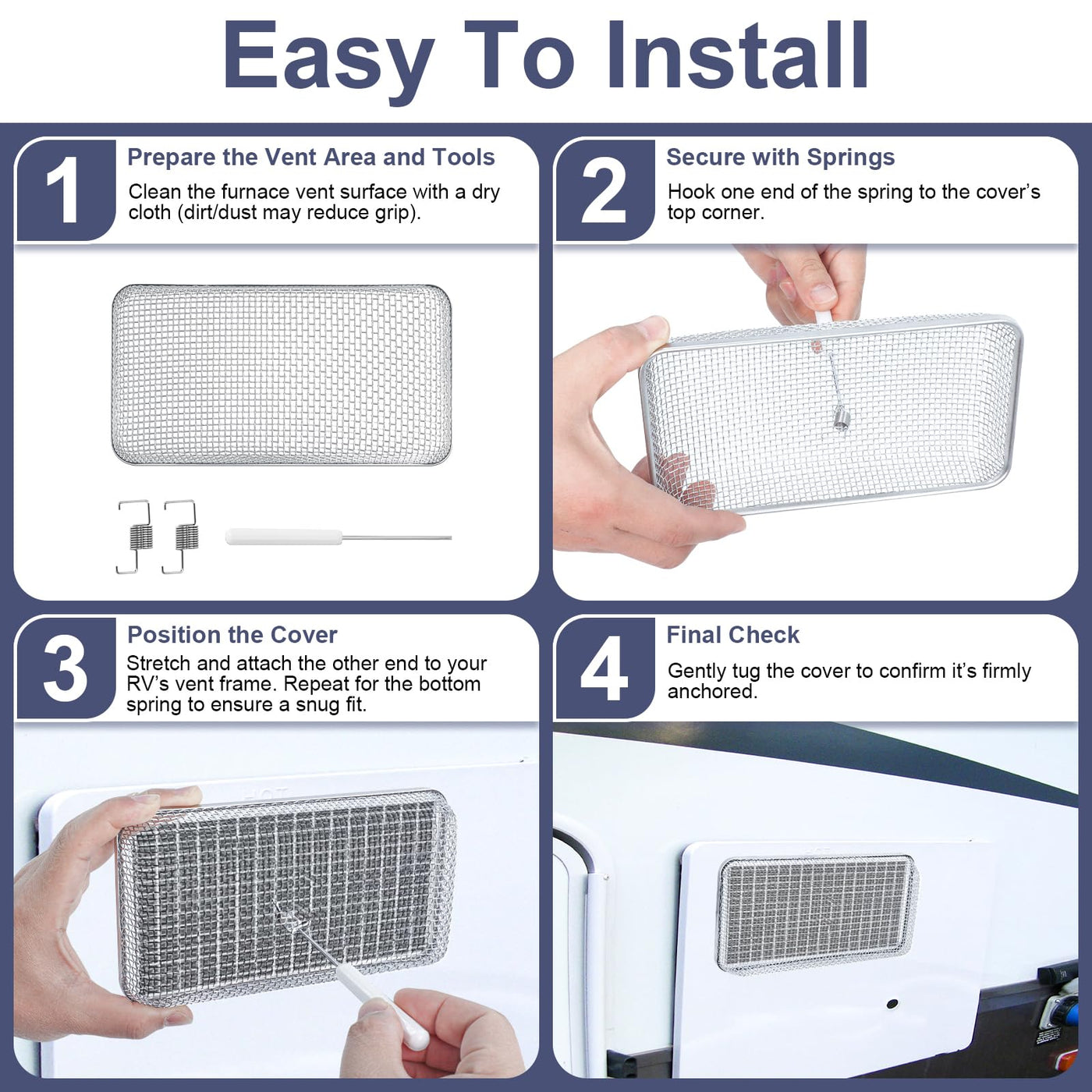 ? Insects are clever infiltrators of private space and perhaps worse in an RV than anywhere else, which is why the RV Bug Vent Screen is exactly what you need. This vent is designed and recommended for RV enthusiasts to fend off wasps, mud dauber nests, birds, and rodents that can wreak havoc in your RV. Installation is made easy with the included tool. Allow fresh air to circulate in your motor home or enclosed trailer while keeping the interior ventilated without letting in creepy crawlers or compromising security. This screen makes recreation easy. Package includes: 1 x RV Furnace Vent Cover 1 x Installation Tool 2 x Spring Fasteners