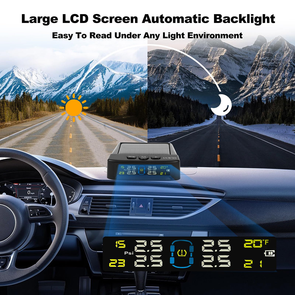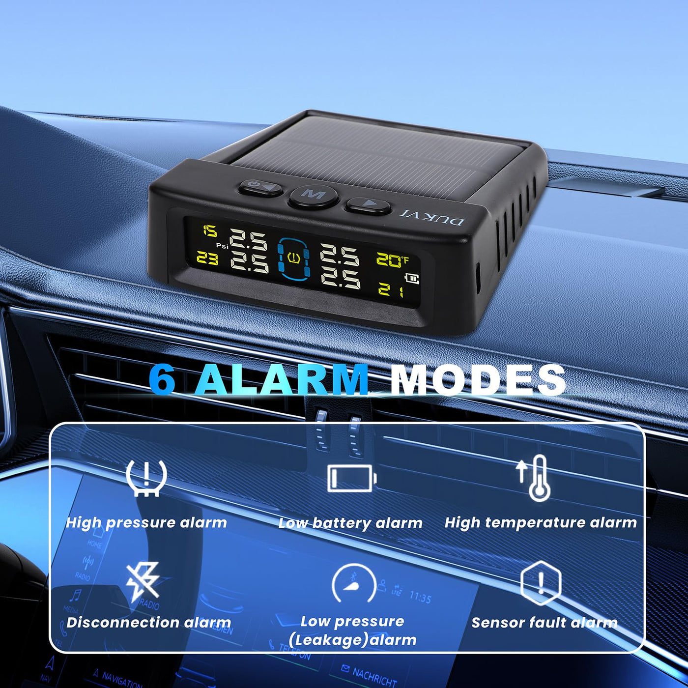 The DUKVI Tire Pressure Monitoring System (TPMS) is your ultimate solution for maintaining optimal tire health and ensuring safety on the road. This advanced Tire Pressure Monitor System is designed to provide you with accurate and real-time tire pressure readings, empowering you to prevent blowouts and enhance fuel efficiency. Featuring six distinct alarm modes, our TPMS guarantees that youre always aware of potential issues before they become serious problems. The large LCD display with automatic backlight makes it easy to read your tire pressure measurements in all lighting conditions, whether you're driving during the day or at night. Two-way charging capabilities ensure that your system remains powered up. You can charge the TPMS via USB or harness the power of the sun with solar charging options. The intelligent on/off functionality helps save battery life by activating only when your vehicle is in motion. Designed with robustness in mind, the DUKVI Tire Pressure Monitoring System is IPX7 waterproof and dust-proof, making it suitable for various environments from city streets to off-road adventures. Plus, with anti-theft protection, you can rest assured knowing your TPMS is safe from unwarranted removal. The DUKVI TPMS is ideal for car enthusiasts, families, and anyone who values vehicle safety and performance. Dont leave your tire safety to chance-invest in the DUKVI Tire Pressure Monitoring System today and drive with confidence! With our tire pressure sensors set of 4, you can monitor all your tires effectively, ensuring peace of mind on every journey. Stay safe, stay informed with the DUKVI Tire Pressure Monitoring System!