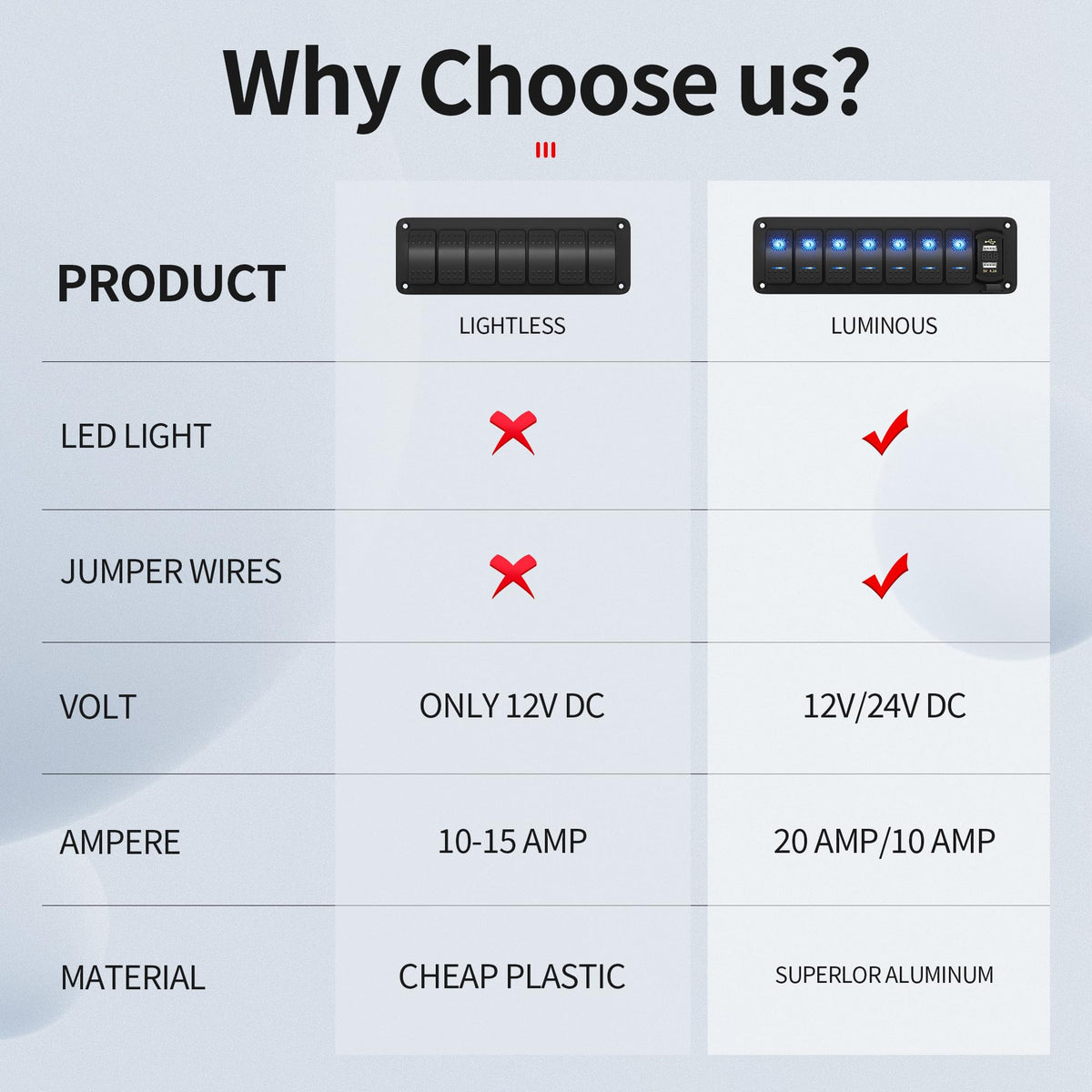 Q: Is this rocker switch panel compatible with 12V and 24V systems?A: Absolutely! The RVBOATPAT switch panel is designed to work with both 12V and 24V DC systems, making it versatile for various vehicles, including boats, trucks, and UTVs.