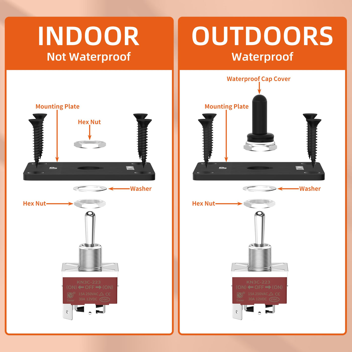 Heavy Duty: Heavy duty toggle switch rating is 30A 12VDC; 20A 125VAC; 15A 250VAC, both polarity reversing switch can be used under DC and AC circuit Polarity Reversing Switch: Momentary ON - OFF - momentary ON DPDT 3 position 4 pin polarity reversal switch is equipped with a polarity reversal jump bar that allows the direction of the motor to be reversed without changing the wiring Easy to Install: The diameter of the toggle switch mounting hole is 0.48 inch (12mm), and the toggle switch mounting plate can be installed in any suitable position for easy switch operation. The toggle switch comes with 4 wires, which greatly saves installation time What You Get: 1 x reverse polarity toggle switch, 1 x waterproof boot cap, 1 x mounting panel,4 x wires and 4 x screws Wide Application: 12V toggle switch suitable for most cars, ships, yachts, jeeps, campers, caravans, household appliances and industry, toggle switch enables efficient motor control