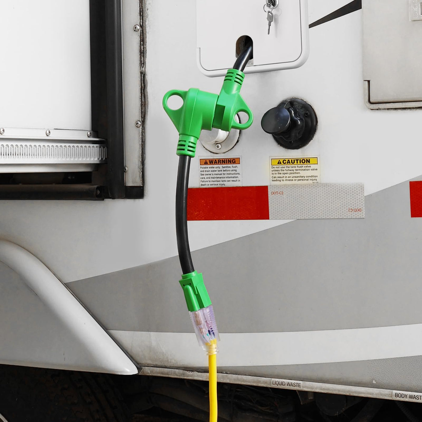 Wide Use: 15A male to 30A female adapter allows you to convert the house power easily, supply power for low-power electrical appliances, and keep the batteries charged during storage. | Electrical Rating: 15A (NEMA 5-15P ) male to 30A (NEMA TT-30R) female adapter with LED power indicator. It's rated for 125V and 1875W, constructed with 10/3 gauge wires. | ETL Listed: Our entire product is ETL/cETL certified, providing a higher level of safety for your RV compared to other brands that only have certification for their parts. | Superior Durability: Molded and made of 100% pure copper wiring coated with a heavy duty flame retardant, UV-resistant polyvinyl plastic sleeve that serves as protection from outdoor elements, wear and tear. | Disconnect Handle: Easier to plug in and plug out without damaging the cable, and it keeps your fingers away from the power source to avoid accidental injury. | Power Indicating: Power indicator light visually informs the user when the cord is connected to the power source.