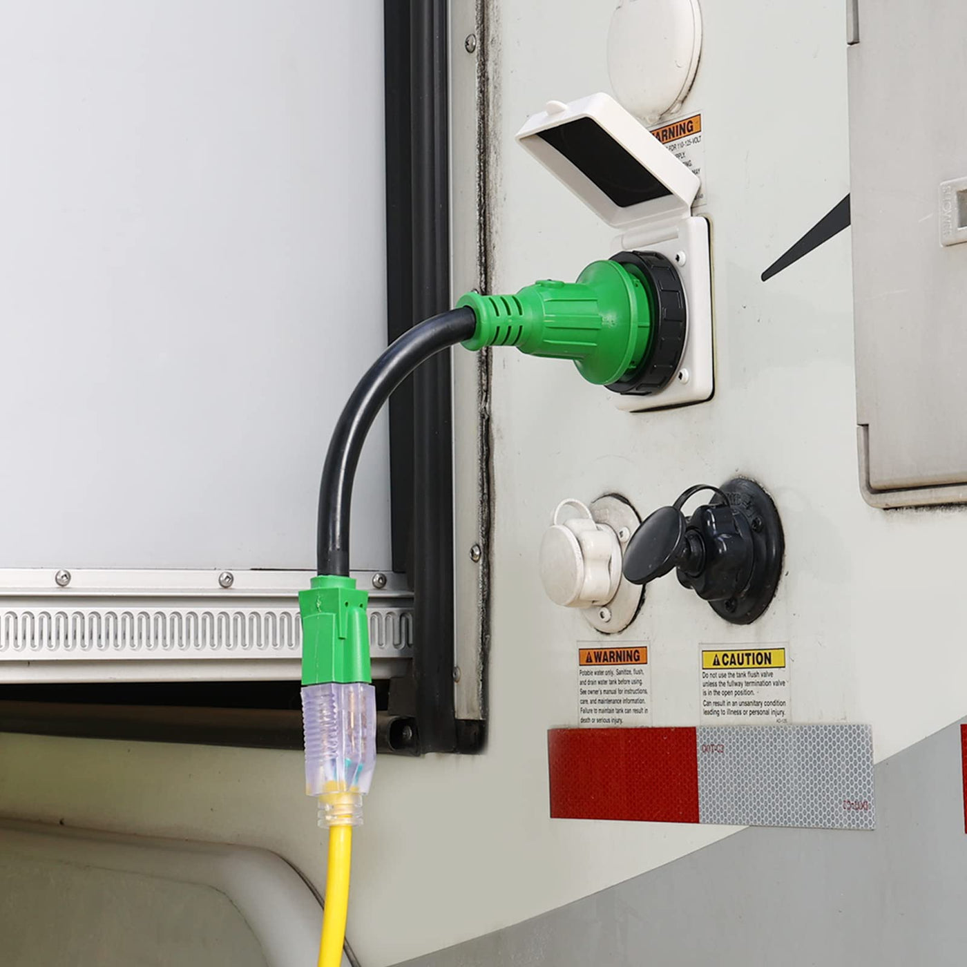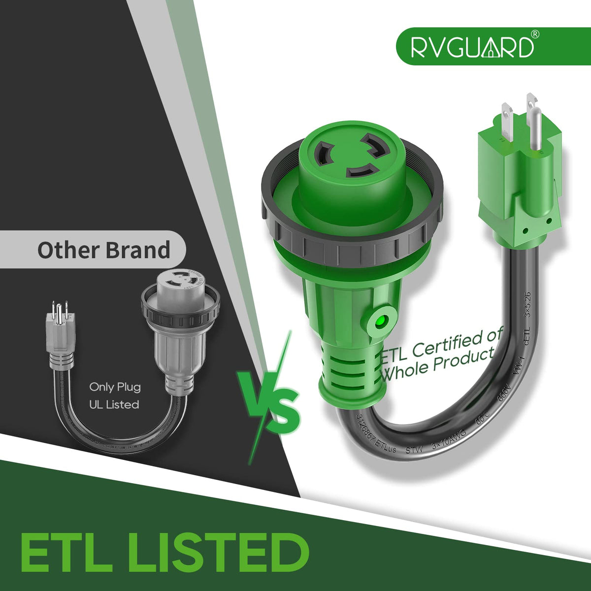Q: What safety features does this RV adapter cord include?A: The RVGUARD adapter cord is ETL Listed, ensuring it meets safety standards. It also features a locking connector to prevent accidental disconnections, providing secure power delivery.