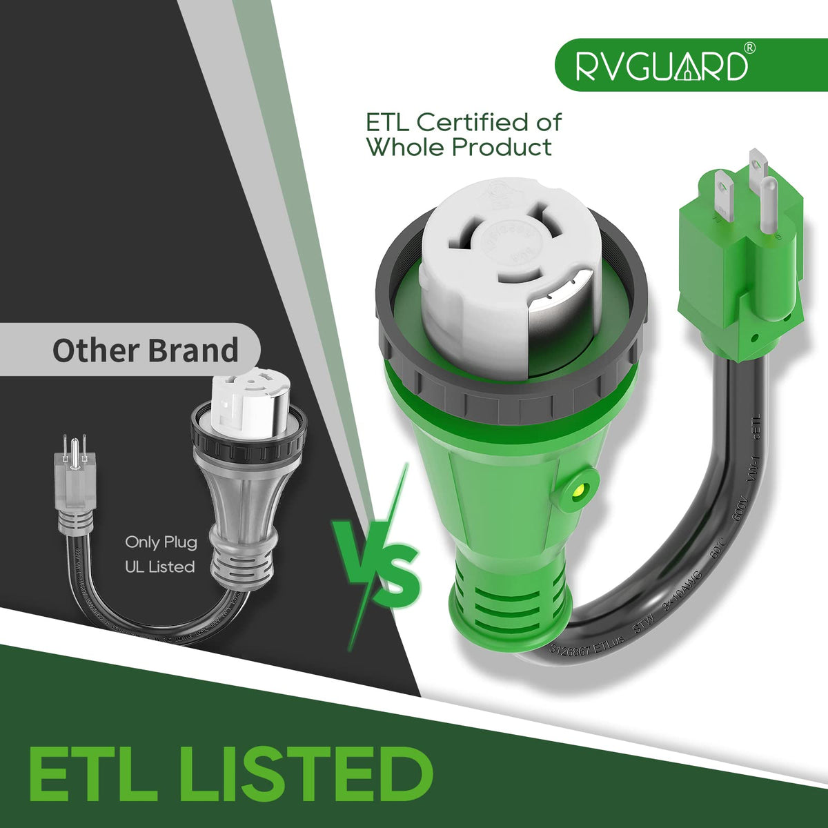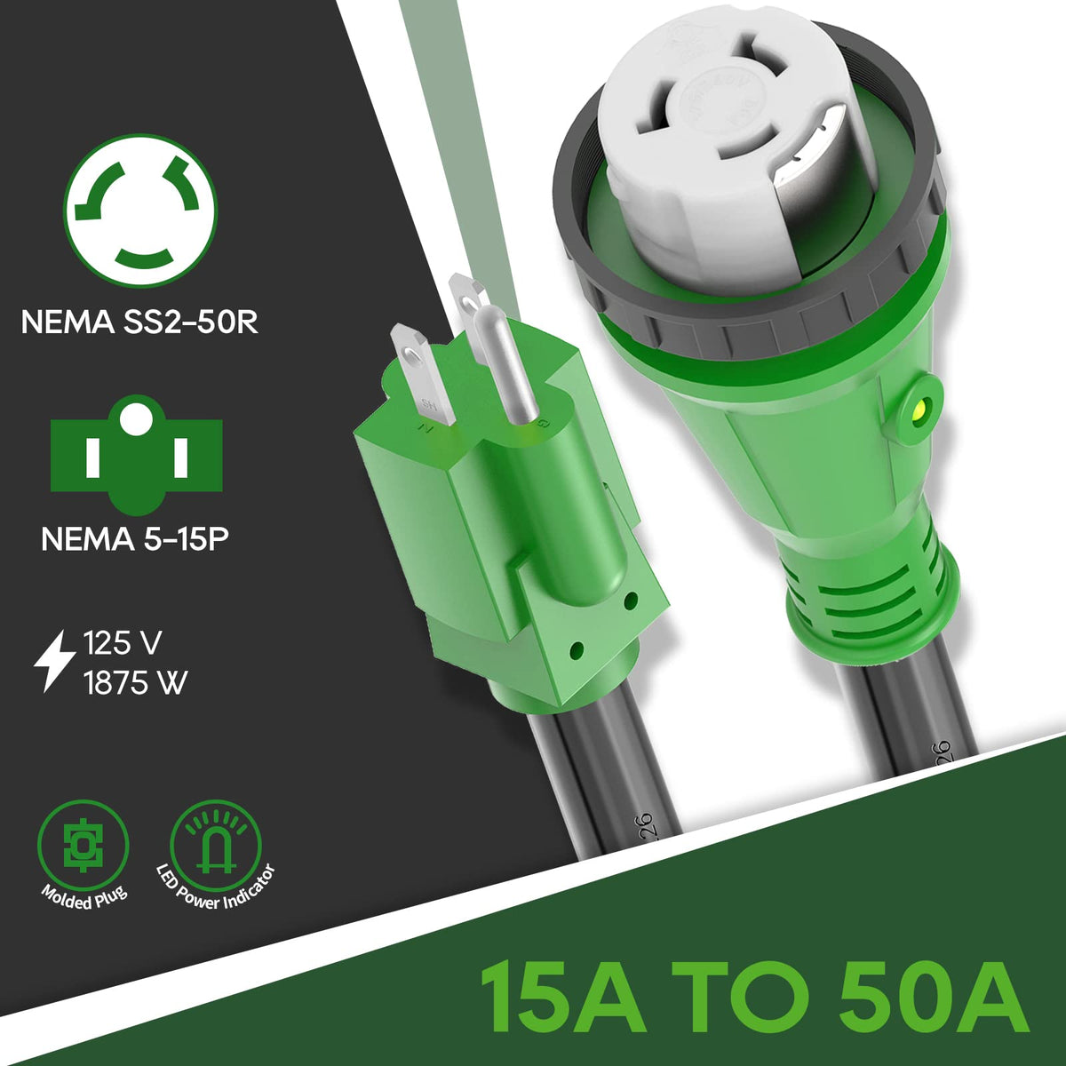 Wide Use: 15A male to 50A female adapter allows you to convert the house power easily, supply power for low-power electrical appliances, and keep the batteries charged during storage. | Electrical Rating: 15A (NEMA 5-15P ) male to 50 Amp (NEMA SS2-50R) female adapter with LED power indicator. It's rated for 125V and 1875W, constructed with 10/3 gauge wires. | ETL Listed: Our entire product is ETL/cETL certified, providing a higher level of safety for your RV compared to other brands that only have certification for their parts. | Superior Durability: Molded and made of 100% pure copper wiring coated with a heavy duty flame retardant, UV-resistant polyvinyl plastic sleeve that serves as protection from outdoor elements, wear and tear. | Safe Construction: There is a threaded ring on the locking connector for regulating and waterproofing.