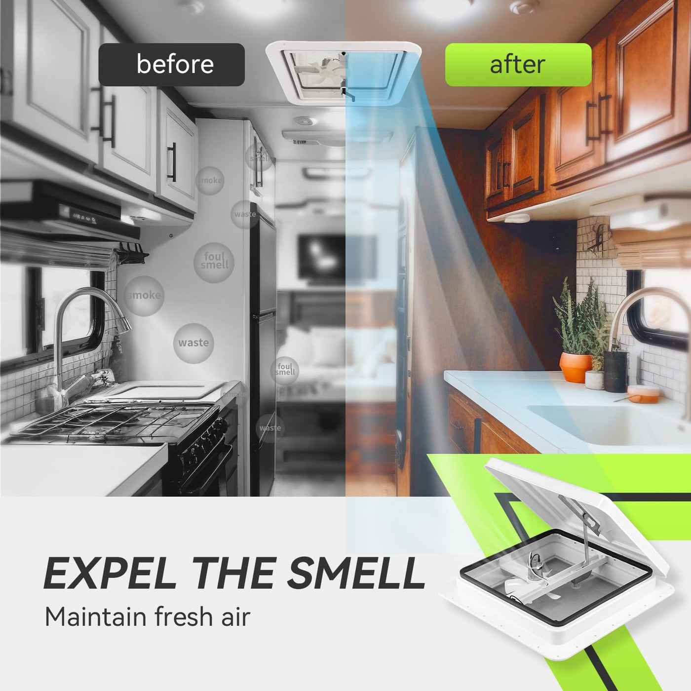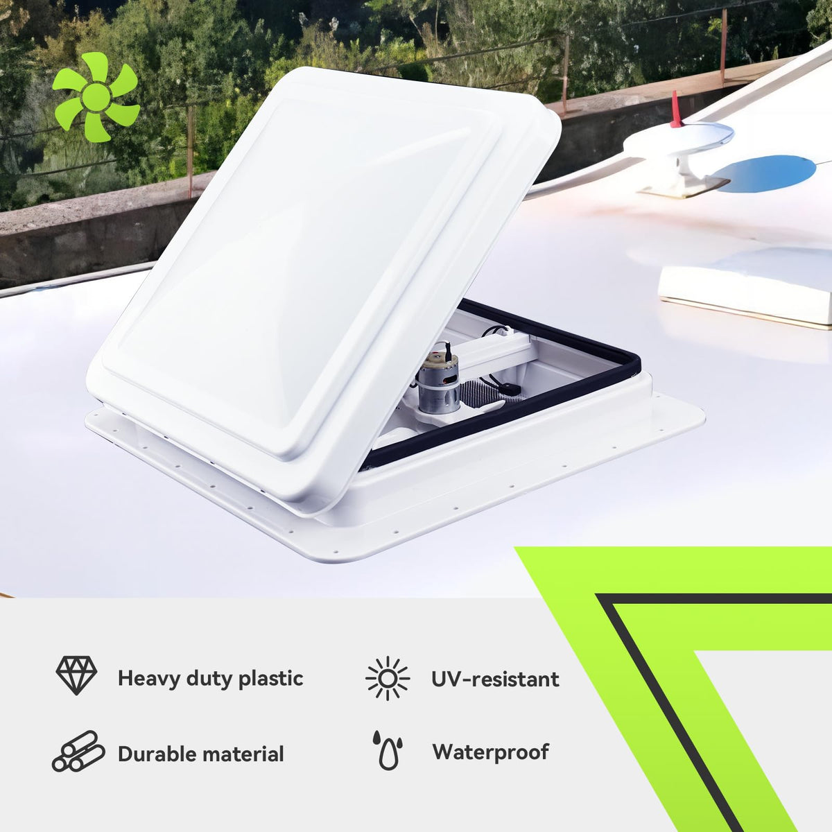 This roof vent fan comes with remote control and has the functions of air in/out, which can take fresh air in and expel smell out. You can use the remote control to switch on/off the fan anywhere in RV, push-button A means air in, B means air out, C means off. | This RV roof vent fan provides a fantastic air circulation for RV, trailer camper and other vehicles, helps to lower indoor temperature & reduce smell from food, smoke, waste, pets, etc. It is a great choice to replace your old cracked roof vent whose size is 14'' x 14''. | The RV roof vent is made of durable plastic material which is UV-resistant and waterproof. The Putty tape helps to seal the frame into your RV roof perfectly and prevent the rainwater in. | Easy to install, insert vent in rough opening on top of putty tape, use an awl or nail to locate and line up corner drilled holes with the corner screw holes in vent frame. | Package Includes 12V RV roof vent fan *1, Remote *1, putty tape *1 and manual handle *2.