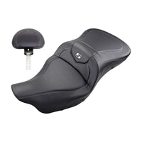 Q: How does the heat adjustment feature work on the Saddlemen Road Sofa Seat?A: The seat includes a two-level heat adjustment system that connects easily to your bike's electrical system. It features independently-controlled heating elements for both the rider and passenger, with brightly-colored LEDs indicating the heat level, ensuring a comfortable ride in colder conditions.