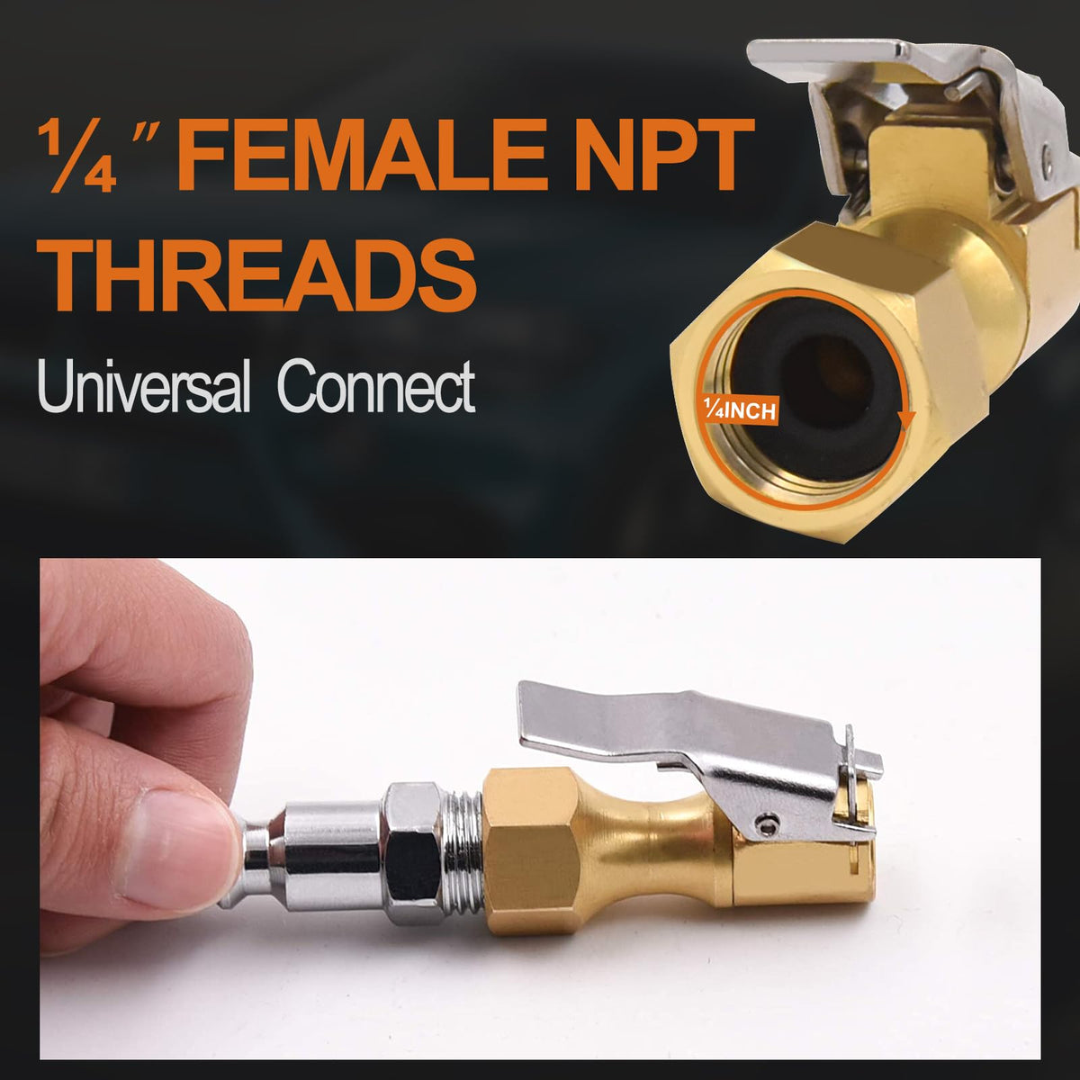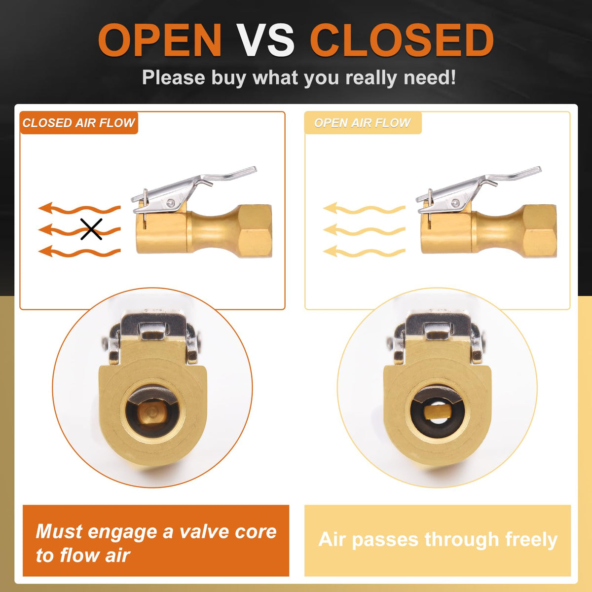 Brass Air Chuck Closed Flow Tire Chuck Heavy Duty Lock On Tire Inflator Chuck with Clip Compatible with schrader valves; the closed flow design allows air to flow when the internal flow valve is open. Specifications: Material: brass Size: 1.73*0.63 inch Color: yellow Package including: 2 Open Flow Air Chuck with Clip 2 '' NPT Quick Connect Male Fitting Note: ONLY Compatible with schrader valves, NOT compatible with Presta valves