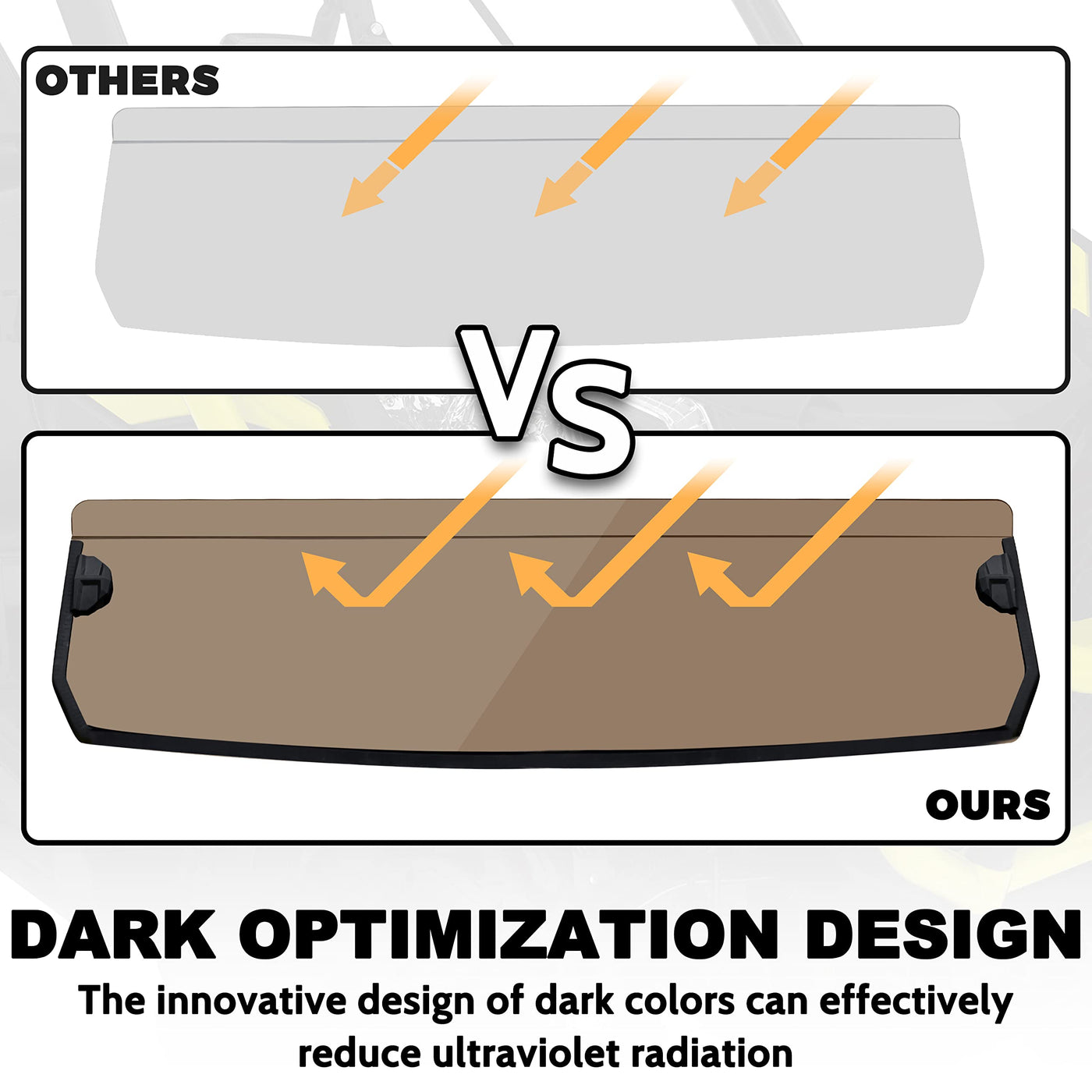 Features: Made Of High Quality 1/5'' Polycarbonate Panel, Light And Strong, Make You Comfortable When Driving In Any Season Polycarbonate Is More Stronger Than Glass; Hard Coat Layer For Durability And Scratch Resistance The Innovative Design Of Dark Colors Can Effectively Reduce Ultraviolet Radiation The No-Frame Design Offers Maximum Visibility