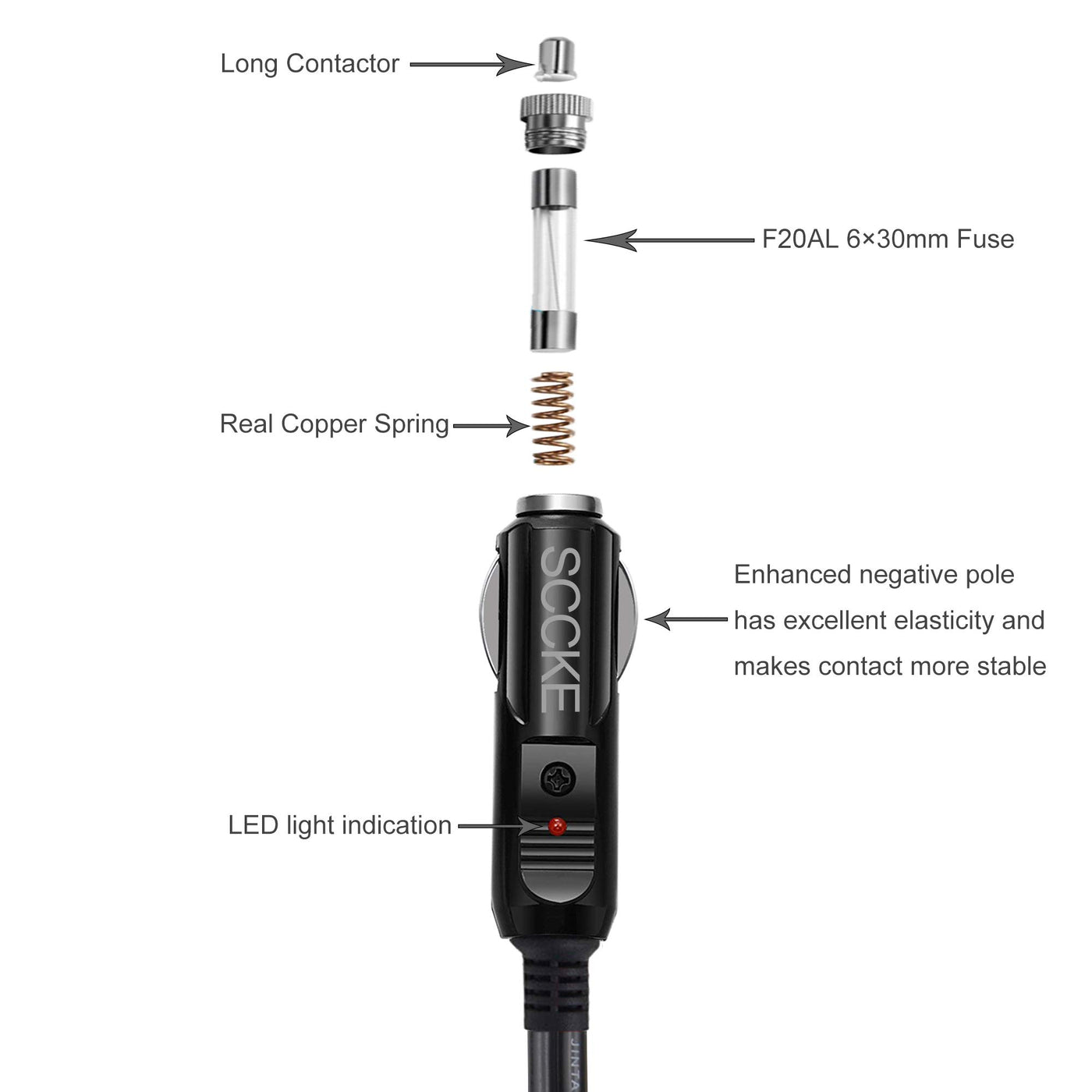 SCCKE Heavy-Duty 20A 14.8ft / 4.5m 14 AWG Male to Male Plug Cigarette Lighter Charger Cord with LED Indicator and 20A Fuse Prote