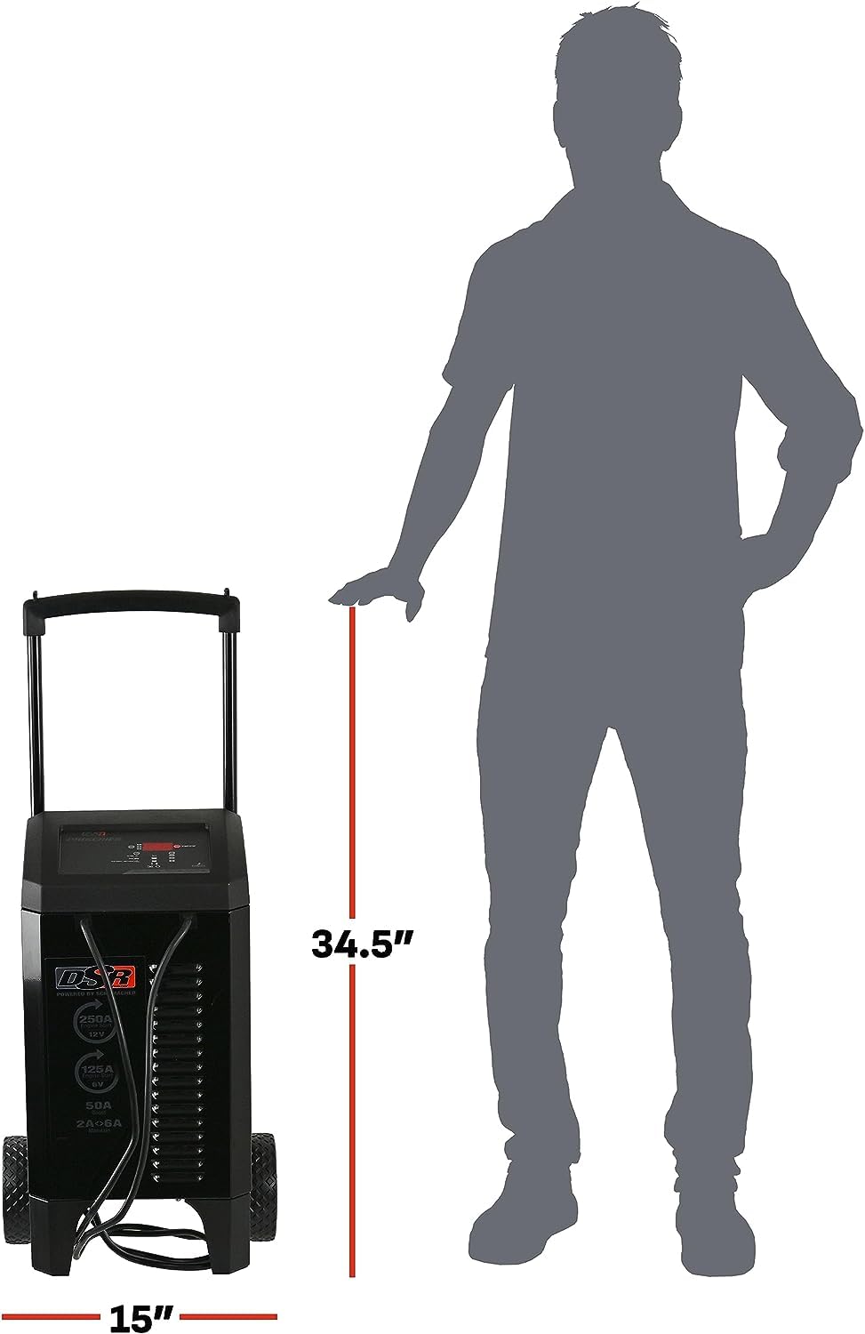 - Q: What are the dimensions of the Schumacher DSR131 battery charger? A: The Schumacher DSR131 measures eleven point eight inches in length, eleven point eight inches in width, and twenty four inches in height. This compact design makes it portable and easy to store.