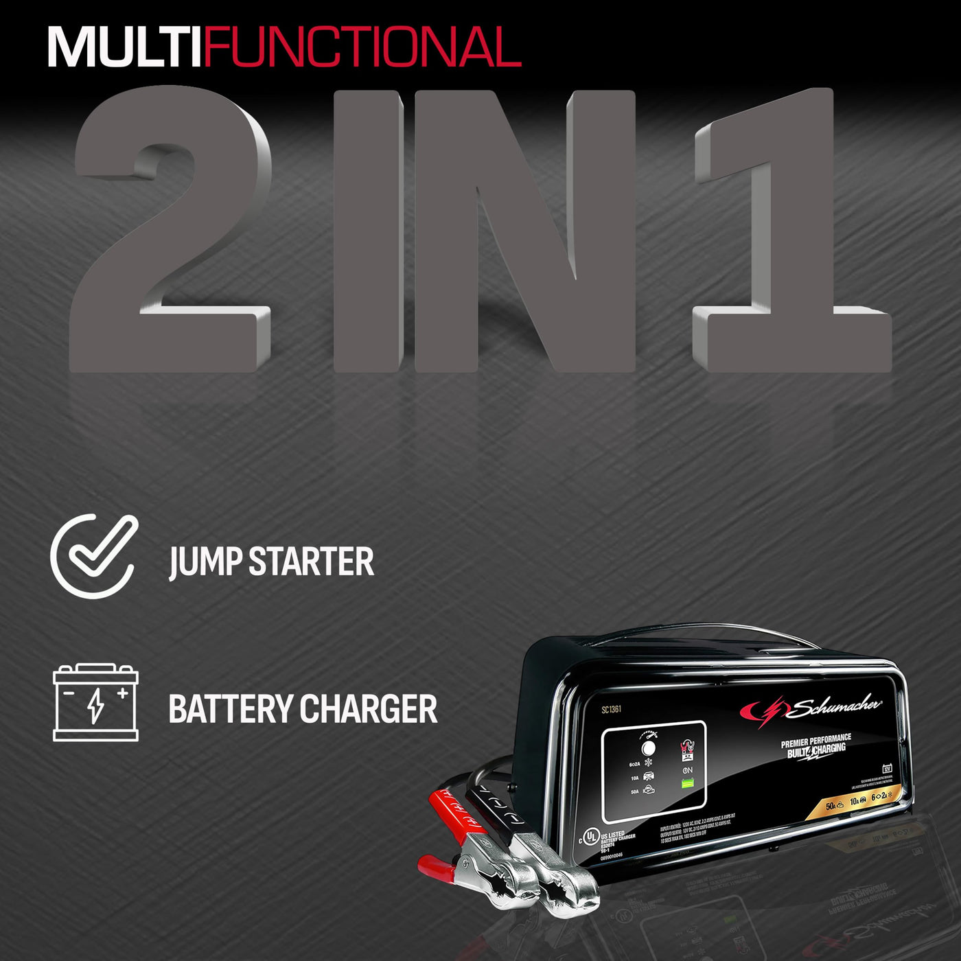 Designed to withstand tough use by serious home mechanics, the Schumacher Electric SC1305 Fully Automatic Battery Charger and Jump Starter is perfect for everyday engine starting and battery charging/maintaining. The SC1305 features 50-amp engine start, 10-amp boost, and 6-amp2-amp charge/maintain rates. Plus, it features durable construction with a metal enclosure that will stand up to bumps and bruises. Fully automatic and microprocessor controlled, the SC1305 boasts advanced features such as multi-stage charging, bad battery detection, float mode monitoring, and reverse hook-up protection. It is compatible with 12-volt standard and AGM batteries. Other features include LED indicators, a push-button interface, and color-coded clamps. En espaol (ES): Diseado para resistir el uso intensivo de los mec nicos aficionados, el cargador de bater a y arrancador Schumacher SC1305 de 50A y 12V es perfecto para el arranque diario de motores y la carga/mantenimiento de bater as. El SC1305 cuenta con capacidades de arranque de motores de 50 A, refuerzo de 10 A y carga/mantenimiento de 6 A2 A. Adem s, tiene una carcasa met lica resistente a golpes y abolladuras. Totalmente autom tico y controlado por un microprocesador, el SC1305 cuenta con funciones avanzadas como carga multietapa, detecci n de bater as defectuosas, monitoreo del modo de flotaci n y protecci n contra conexi n inversa. Es compatible con bater as de 12 V est ndares y AGM. Otras caracter sticas incluyen indicadores LED, una interfaz con botones y pinzas codificadas por colores.
