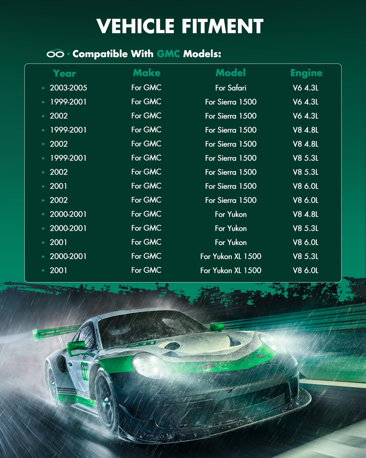 Vehicle Information:2000-2002 For Cadillac For DeVille V8 4.6L2003-2005 For Chevrolet For Astro V6 4.3L1999-2001 For Chevrolet For Silverado 1500 V6 4.3L2002 For Chevrolet For Silverado 1500 V6 4.3L 2 Wheel Steering1999-2001 For Chevrolet For Silverado 1500 V8 4.8L2002 For Chevrolet For Silverado 1500 V8 4.8L 2 Wheel Steering1999-2001 For Chevrolet For Silverado 1500 V8 5.3L2002 For Chevrolet For Silverado 1500 V8 5.3L 2 Wheel Steering2000-2001 For Chevrolet For Suburban 1500 V8 5.3L2000-2001 For Chevrolet For Tahoe V8 4.8L2000-2001 For Chevrolet For Tahoe V8 5.3L2003-2005 For GMC For Safari V6 4.3L1999-2001 For GMC For Sierra 1500 V6 4.3L2002 For GMC For Sierra 1500 V6 4.3L 2 Wheel Steering1999-2001 For GMC For Sierra 1500 V8 4.8L2002 For GMC For Sierra 1500 V8 4.8L 2 Wheel Steering1999-2001 For GMC For Sierra 1500 V8 5.3L2002 For GMC For Sierra 1500 V8 5.3L 2 Wheel Steering2001 For GMC For Sierra 1500 V8 6.0L2002 For GMC For Sierra 1500 V8 6.0L 2 Wheel Steering2000-2001 For GMC For Yukon V8 4.8L2000-2001 For GMC For Yukon V8 5.3L2001 For GMC For Yukon V8 6.0L2000-2001 For GMC For Yukon XL 1500 V8 5.3L2001 For GMC For Yukon XL 1500 V8 6.0L