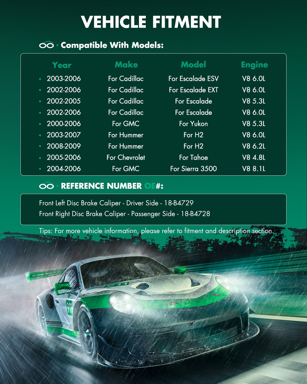 Specification:Placement on Vehicle: Front Left and Right (Driver and Passenger Side)Brake Calipers:Bracket: withInlet Port Size: M10 x 1.5Bleeder Port Size: M10 x 1.5Piston Size: 2.004inchBrake Piston Count: 2 PistonPiston Material: PhenolicCaliper Finish: White ZincificationInterchange Part Number:Front Left Disc Brake Caliper - Driver Side - 18-B4729Front Right Disc Brake Caliper - Passenger Side - 18-B4728Package Includes: 2 x Brake CalipersCompatible with:(For More Details, Please Check ''FITMENT'' in the Upper Left Corner)For Cadillac 2002-2006For Chevrolet 1999-2009For GMC 1999-2008For Hummer 2003-2008