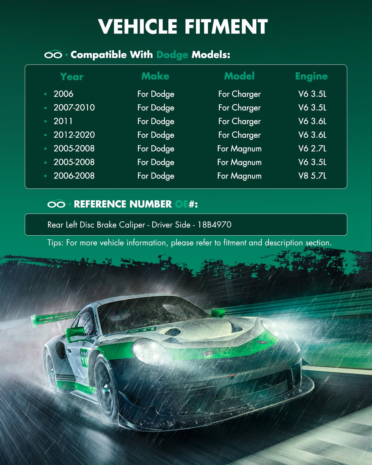 Specification:Placement on Vehicle: Rear Left (Driver Side)Brake Calipers:Bracket: withInlet Port Size: M10 x 1.5Bleeder Port Size: M10 x 1.5Piston Size: 41.88mmBrake Piston Count: 1 PistonPiston Material: PhenolicCaliper Finish: Oxygen OxidationInterchange Part Number: 18B4970Package Includes: 1 x Brake CaliperCompatible with:(For More Details, Please Check ''FITMENT'' in the Upper Left Corner)For Chrysler 2005-2018For Dodge 2005-2018