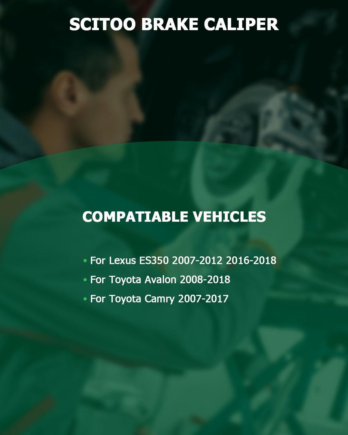 ?Compatible Vehicles?: Replacement For Lexus For ES350 V6 3.5L 2007-2011 2016-2018,For Toyota For Avalon L4 2.5L 2013-2018,For Toyota For Avalon V6 3.5L 2008-2018,For Toyota For Camry L4 2.4L 2007-2011,For Toyota For Camry L4 2.5L 2010-2017,For Toyota For Camry V6 3.5L 2007-2017 | ?Product Informations?: ?1PCS Disc Brake Caliper Assembly; ?Installation Position - Front Passenger Side; ?OE Number - 19B3129; ?Bracket - With; ?Piston Material - Phenolic | ?Product Specifications?: ?Brake Piston Count - 1 Piston; ?Piston Diameter - 2.5 Inch(63.5mm); ?Inlet Port Size - M10 x 1.0-6H; ?Bleeder Port Size - M7 x 1.0-6H | ?Product Features?: SCITOO Brake Calipers are coated and multiple tests, meet or exceed OE standard. You will get the best performance and durability, whatever the conditions | ?Direct Installation?: With mounting hardware, designed to provide quick and easy installation without modification